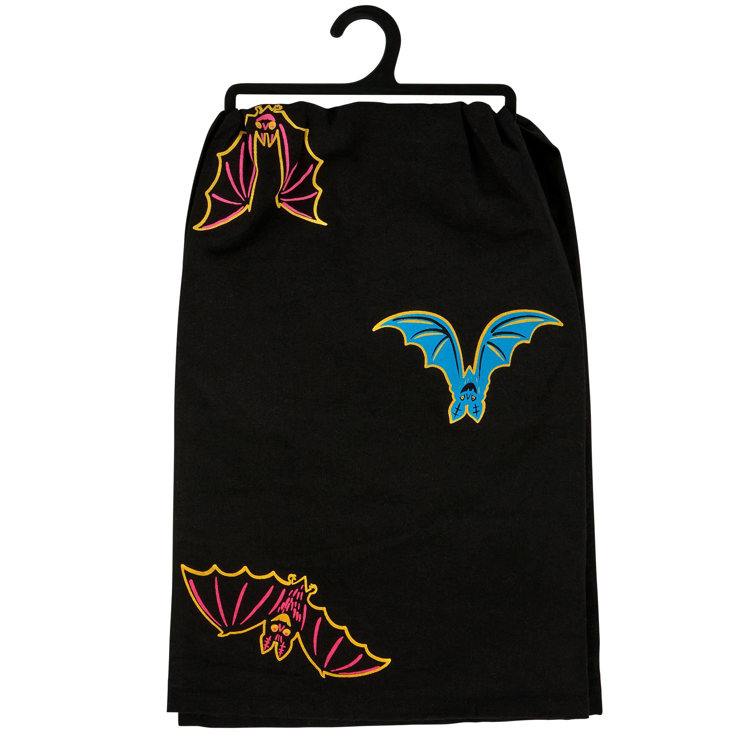 A black cotton kitchen towel from our Halloween Collection displaying all-over designs of bats with a fun Halloween inspired sentiment that reads "Ready For Halloween... Since Last Halloween!" Design and sentiment are replicated from original hand illustrated artwork in a fun neon color palette that also looks great in blacklight. Our Last Halloween kitchen towel is conveniently machine-washable for easy cleaning. Seasonal kitchen towel is packaged on a black plastic hanger to easily display on rack. A fun Halloween-themed kitchen accessory perfect for seasonal use.