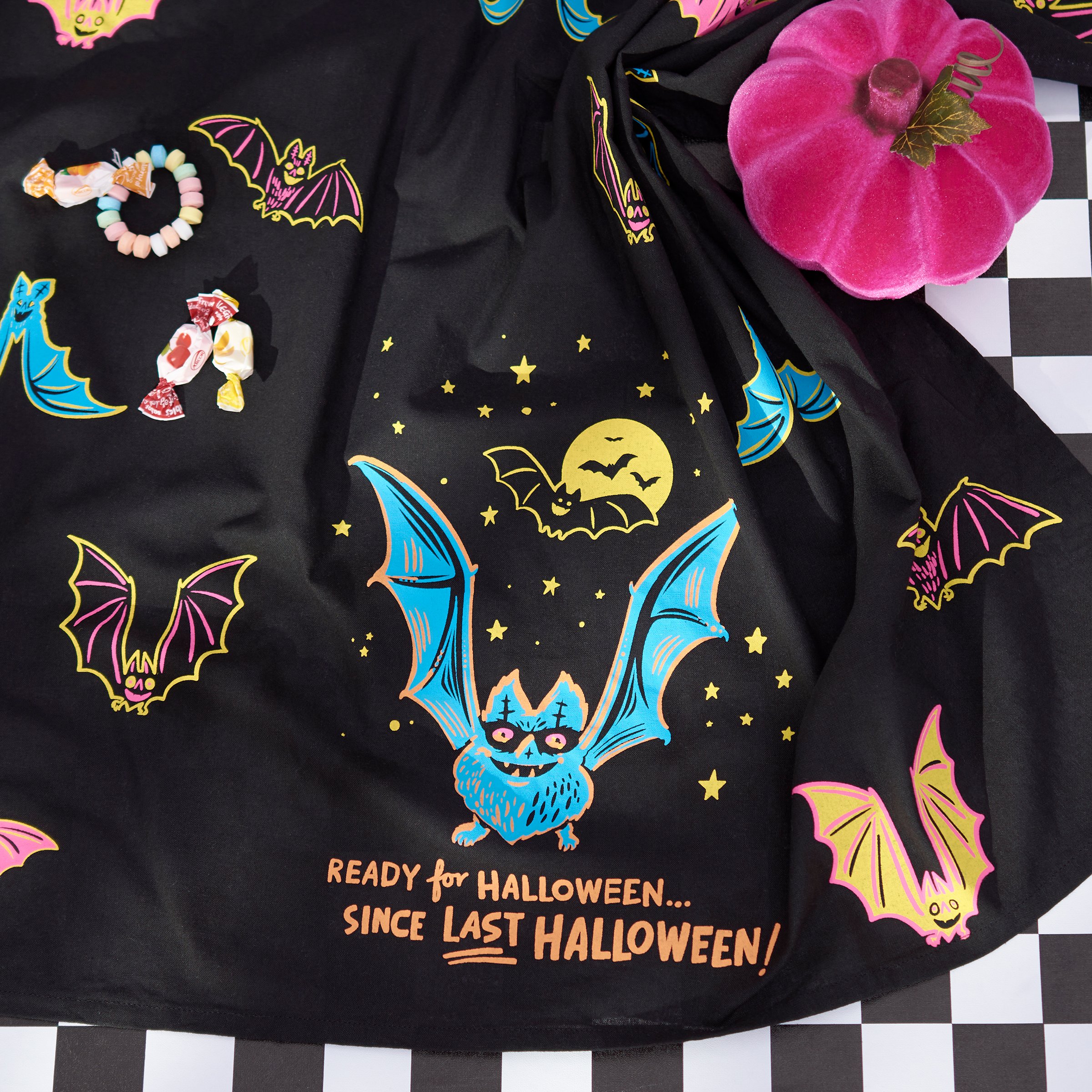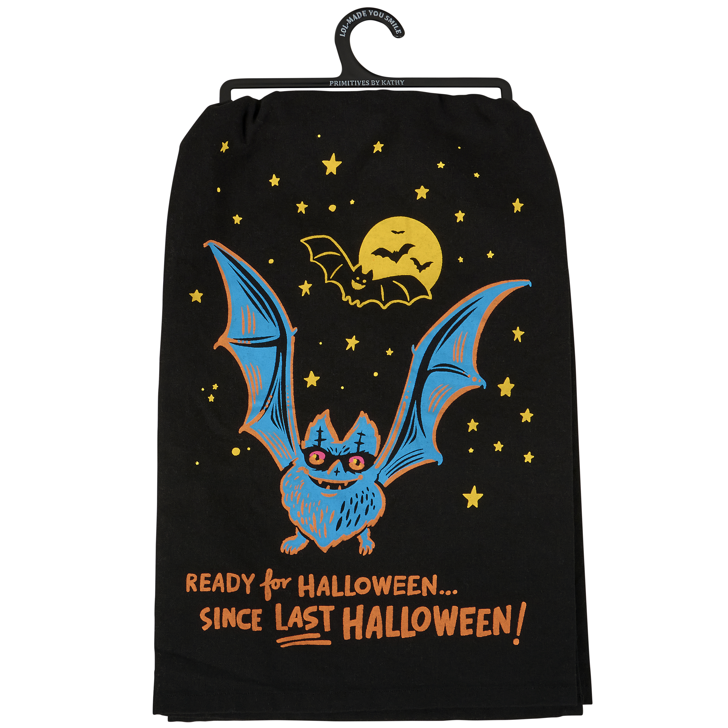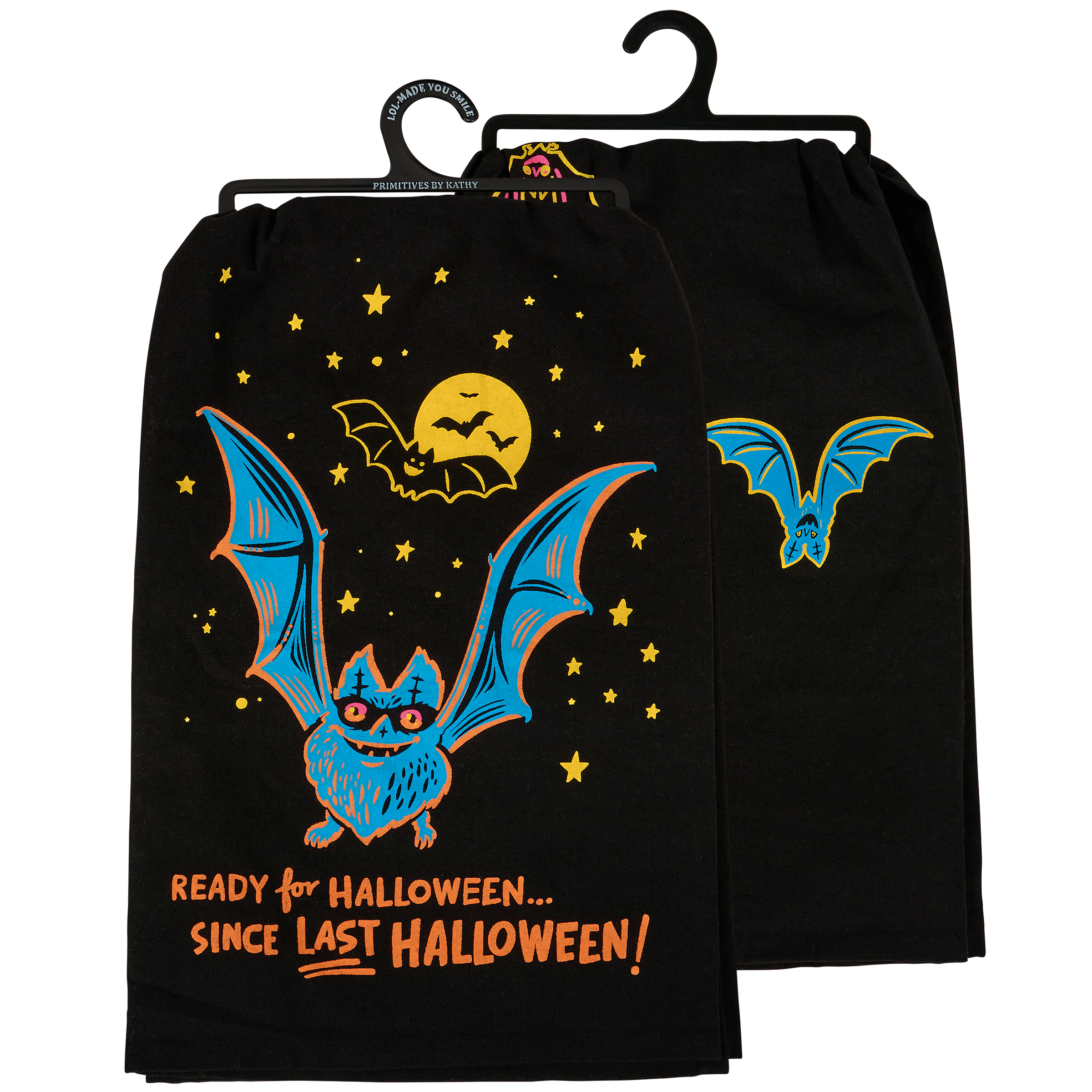 A black cotton kitchen towel from our Halloween Collection displaying all-over designs of bats with a fun Halloween inspired sentiment that reads "Ready For Halloween... Since Last Halloween!" Design and sentiment are replicated from original hand illustrated artwork in a fun neon color palette that also looks great in blacklight. Our Last Halloween kitchen towel is conveniently machine-washable for easy cleaning. Seasonal kitchen towel is packaged on a black plastic hanger to easily display on rack. A fun Halloween-themed kitchen accessory perfect for seasonal use.