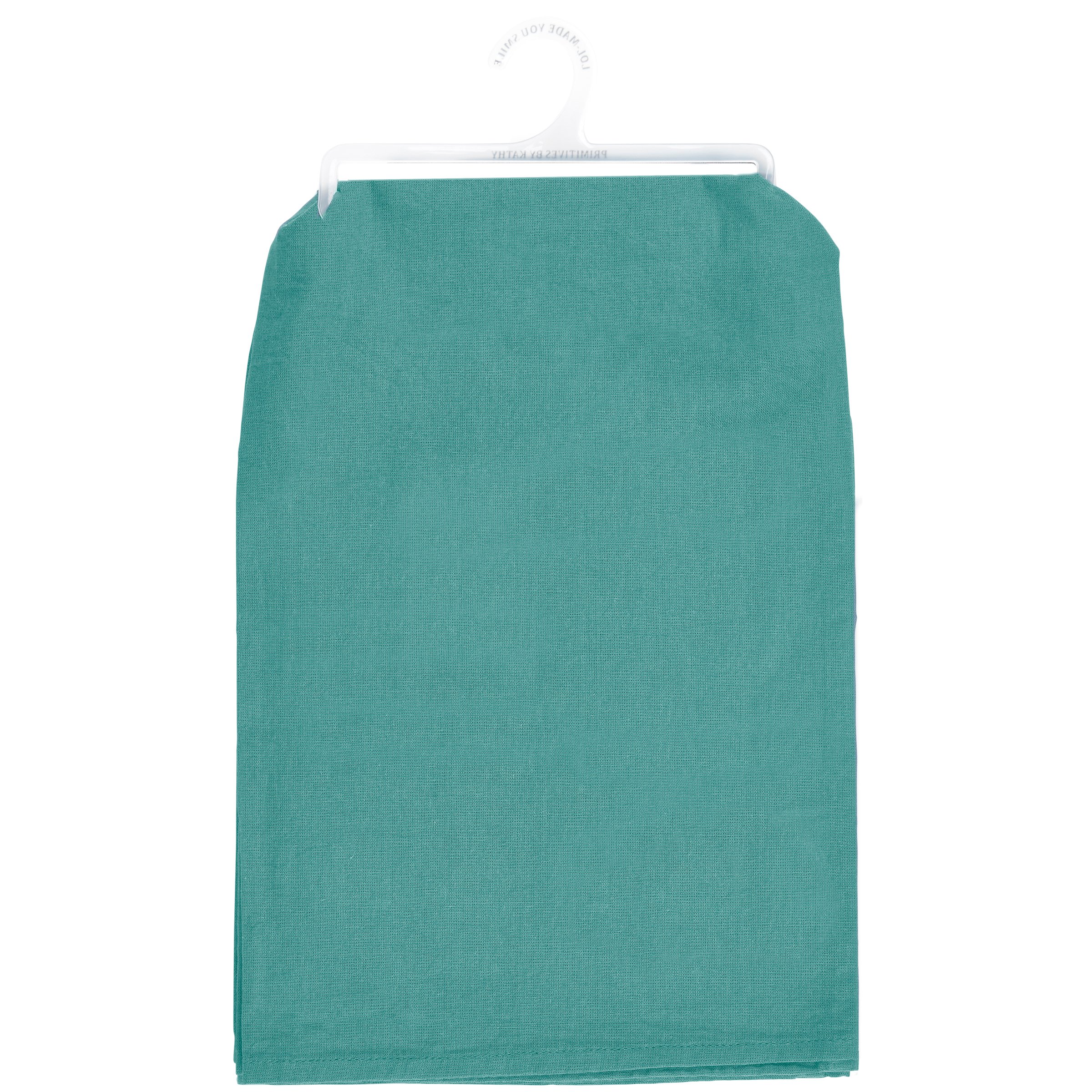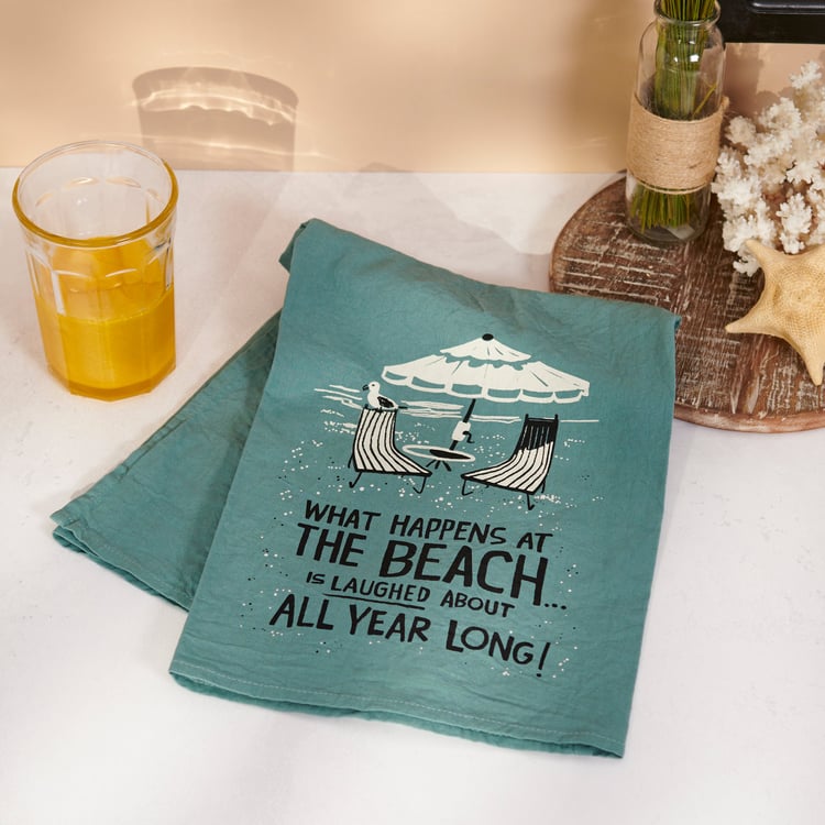 An ocean blue cotton kitchen towel from our Beach Collection displaying a unique hand illustrated design of beach chairs on the sand above a humorous beach-themed sentiment that reads "What Happens At The Beach... Is Laughed About All Year Long!" Our Laughed About kitchen towel is machine-washable for convenient cleaning. Packaged on a clear plastic hanger to easily display on rack. A fun beach-themed kitchen accessory perfect for everyday use.