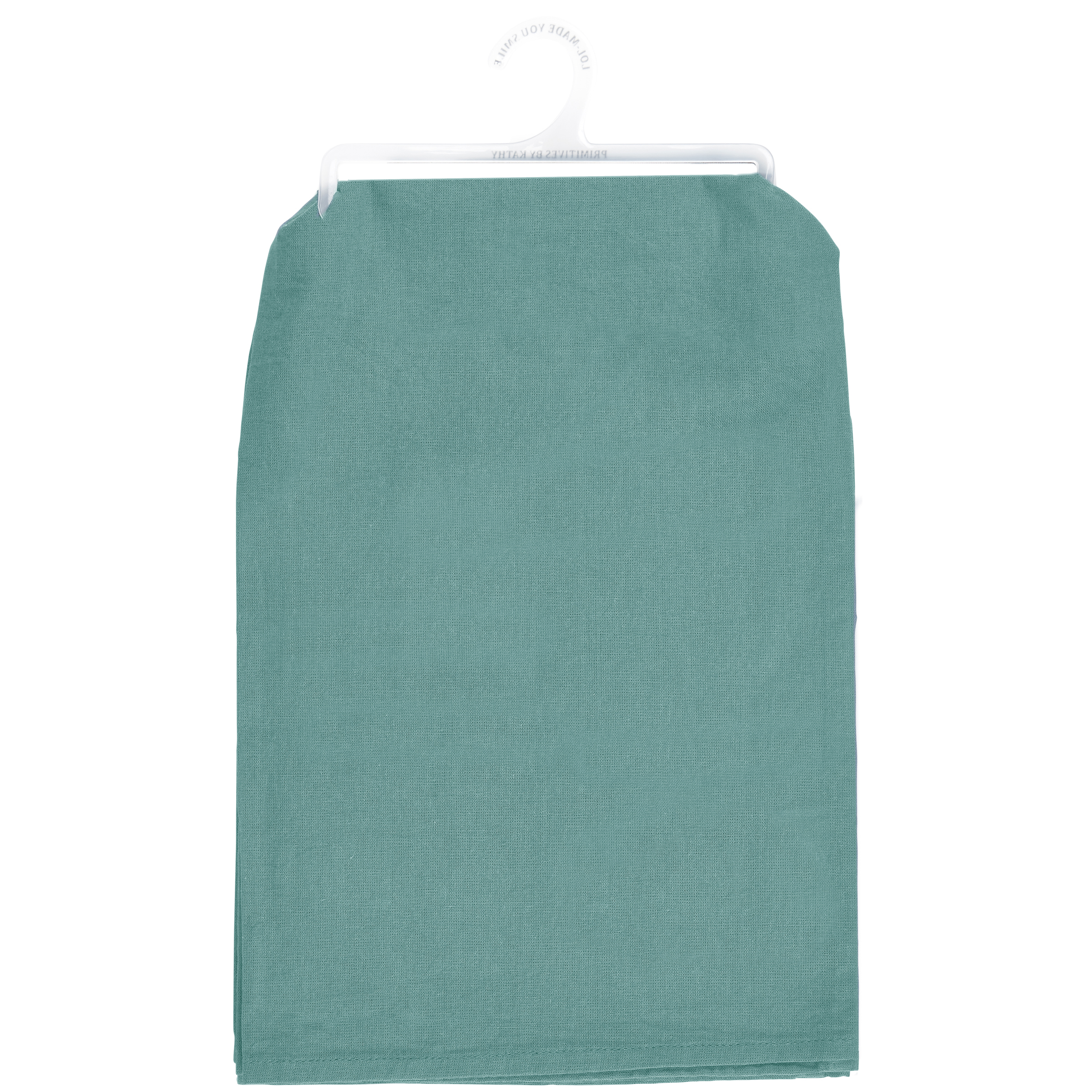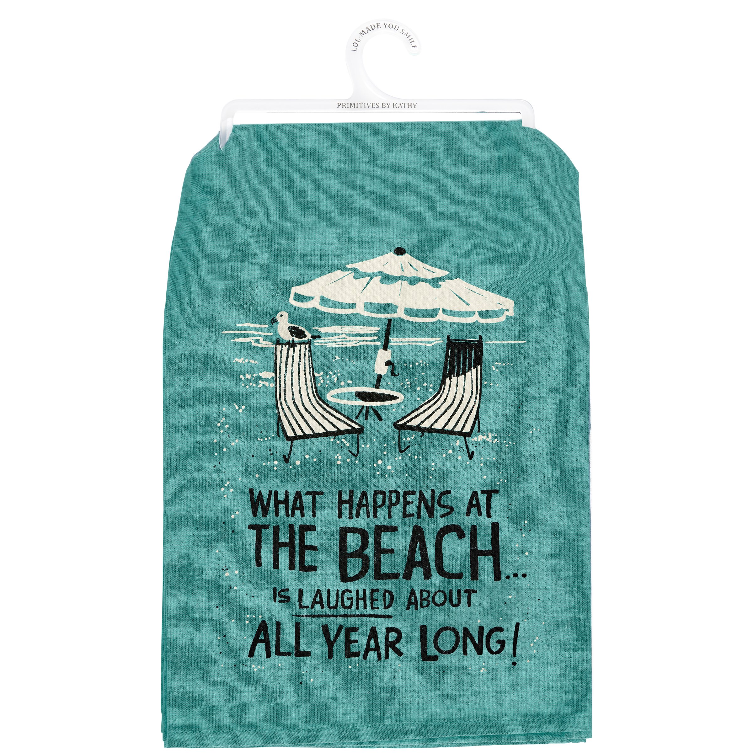 An ocean blue cotton kitchen towel from our Beach Collection displaying a unique hand illustrated design of beach chairs on the sand above a humorous beach-themed sentiment that reads "What Happens At The Beach... Is Laughed About All Year Long!" Our Laughed About kitchen towel is machine-washable for convenient cleaning. Packaged on a clear plastic hanger to easily display on rack. A fun beach-themed kitchen accessory perfect for everyday use.