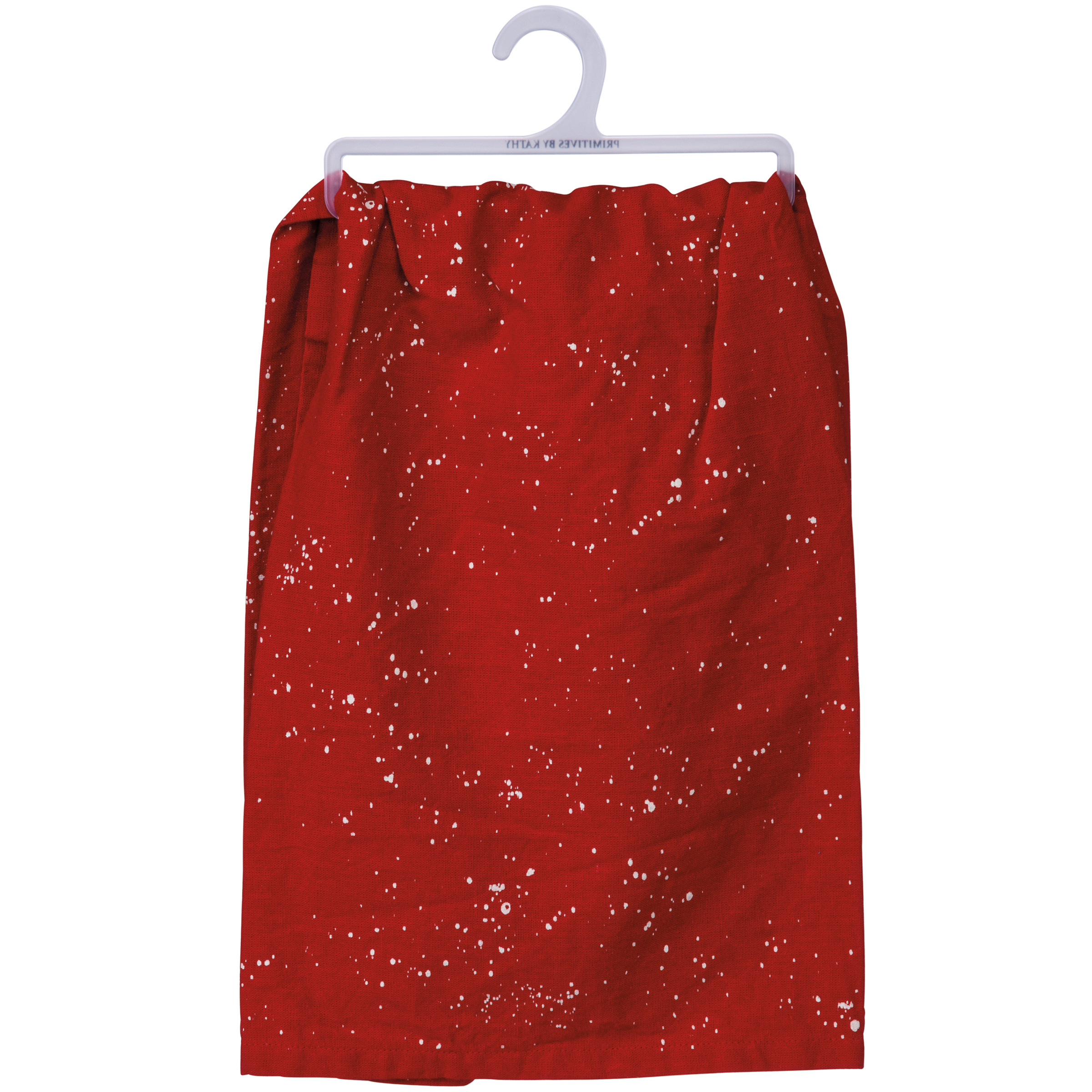A Nordic-inspired cotton kitchen towel featuring a "Let It Snow" sentiment, snowman designs, and snowflake designs throughout. Machine-washable.