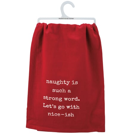 A red cotton kitchen towel featuring a typeset "Naughty Is Such A Strong Word. Let's Go With Nice-ish" sentiment. Our Nice-ish kitchen towel is machine-washable.