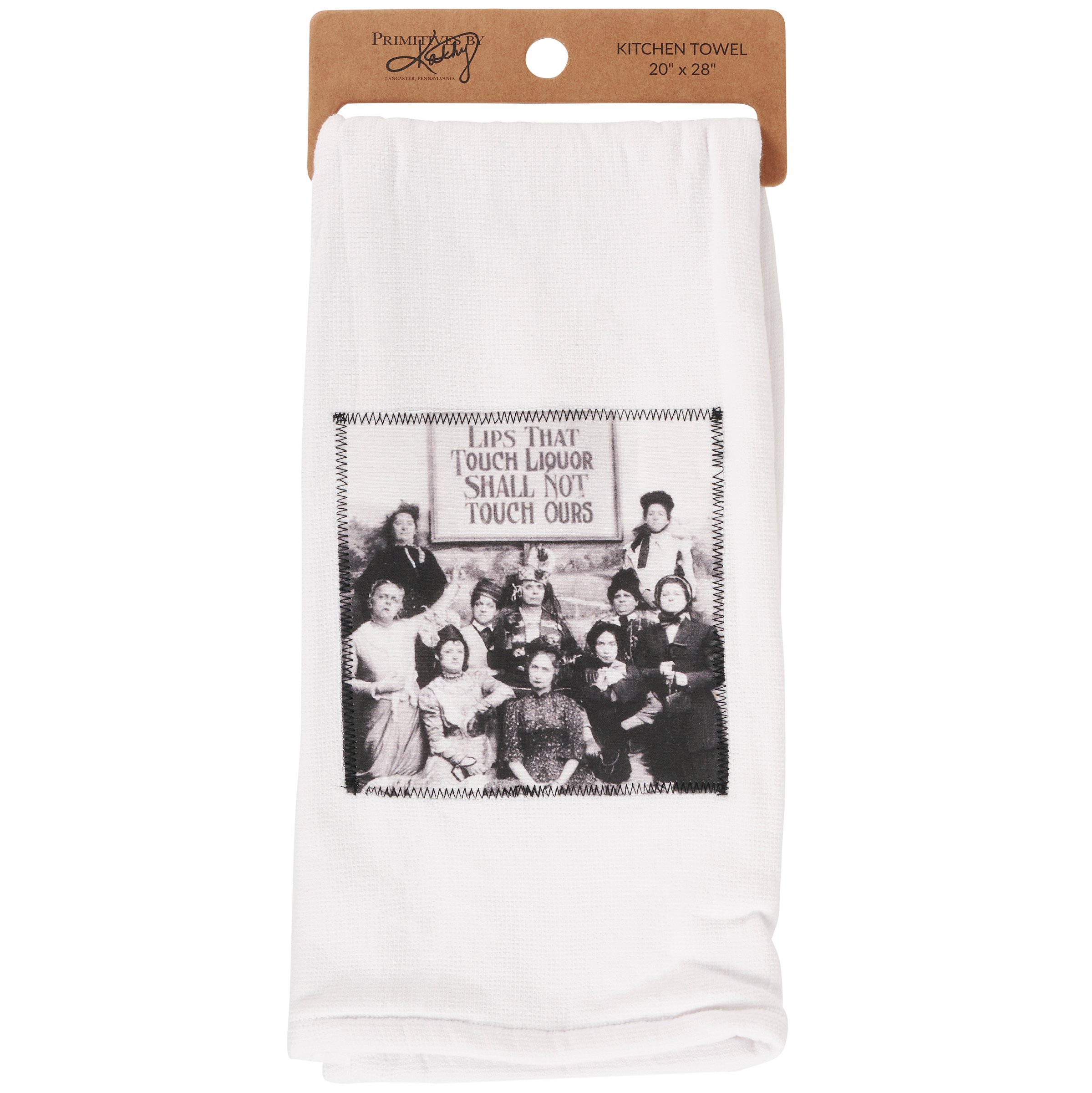 A white cotton kitchen towel from our Art Deco Collection featuring a stitched art panel displaying a vintage black and white photograph of women from the prohibition era holding a sign that reads "Lips That Touch Liquor Shall Not Touch Ours." Prohibition kitchen towel also features a terrycloth layer on the back for added absorbency. Our Lips That Touch Liquor kitchen towel is conveniently machine-washable for easy cleaning. Kitchen towel is packaged on a cardboard hanger with hole to easily display on rack. A vintage bar-themed kitchen accessory perfect for everyday use.