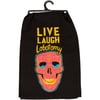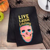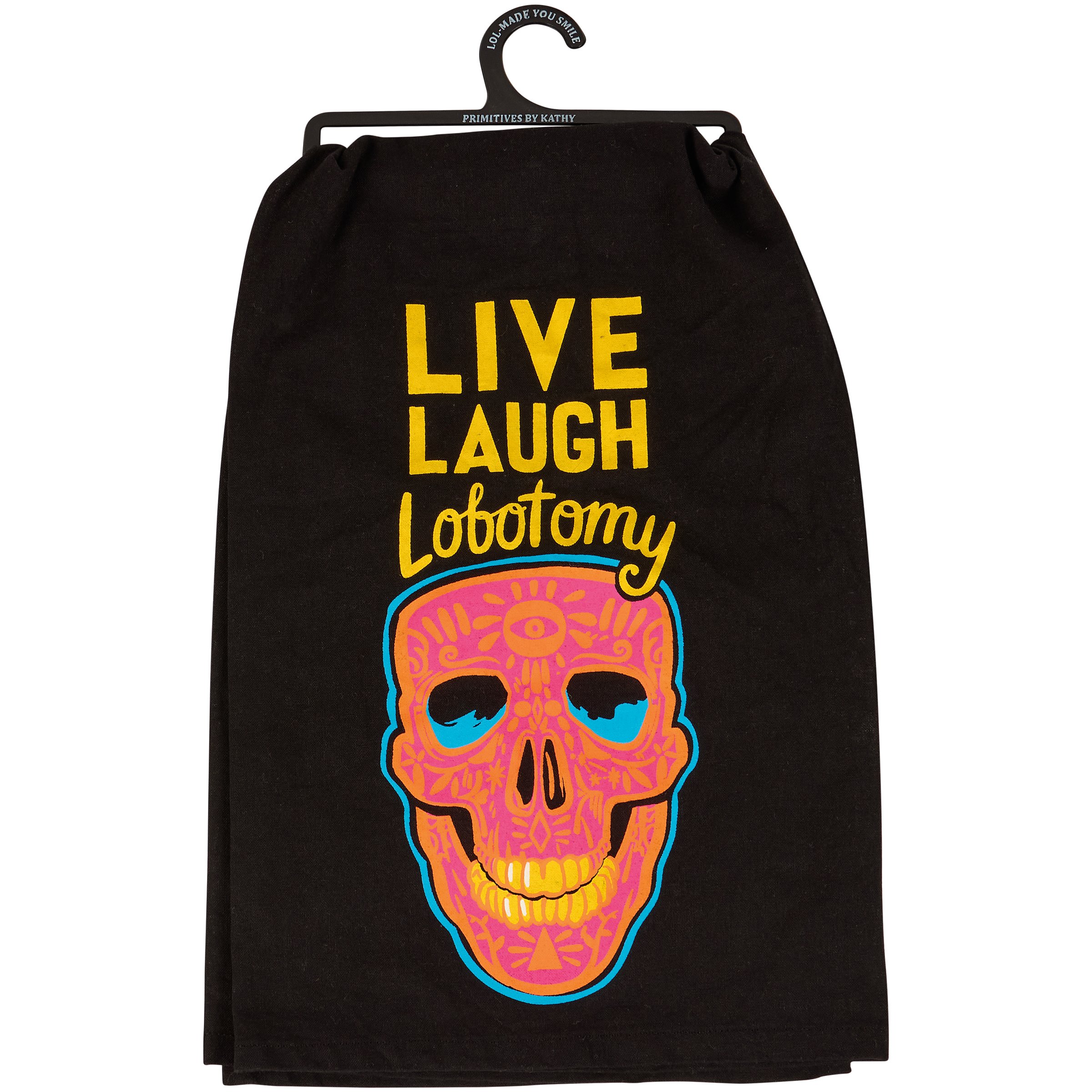 A black cotton kitchen towel from our Halloween Collection displaying a unique hand illustrated design of a sugar skull with a fun Halloween inspired sentiment that reads "Live Laugh Lobotomy." Design and sentiment are replicated from original hand illustrated artwork in a fun neon color palette that also looks great in blacklight. Our Live Laugh kitchen towel is conveniently machine-washable for easy cleaning. Seasonal kitchen towel is packaged on a black plastic hanger to easily display on rack. A fun Halloween-themed kitchen accessory perfect for seasonal use.