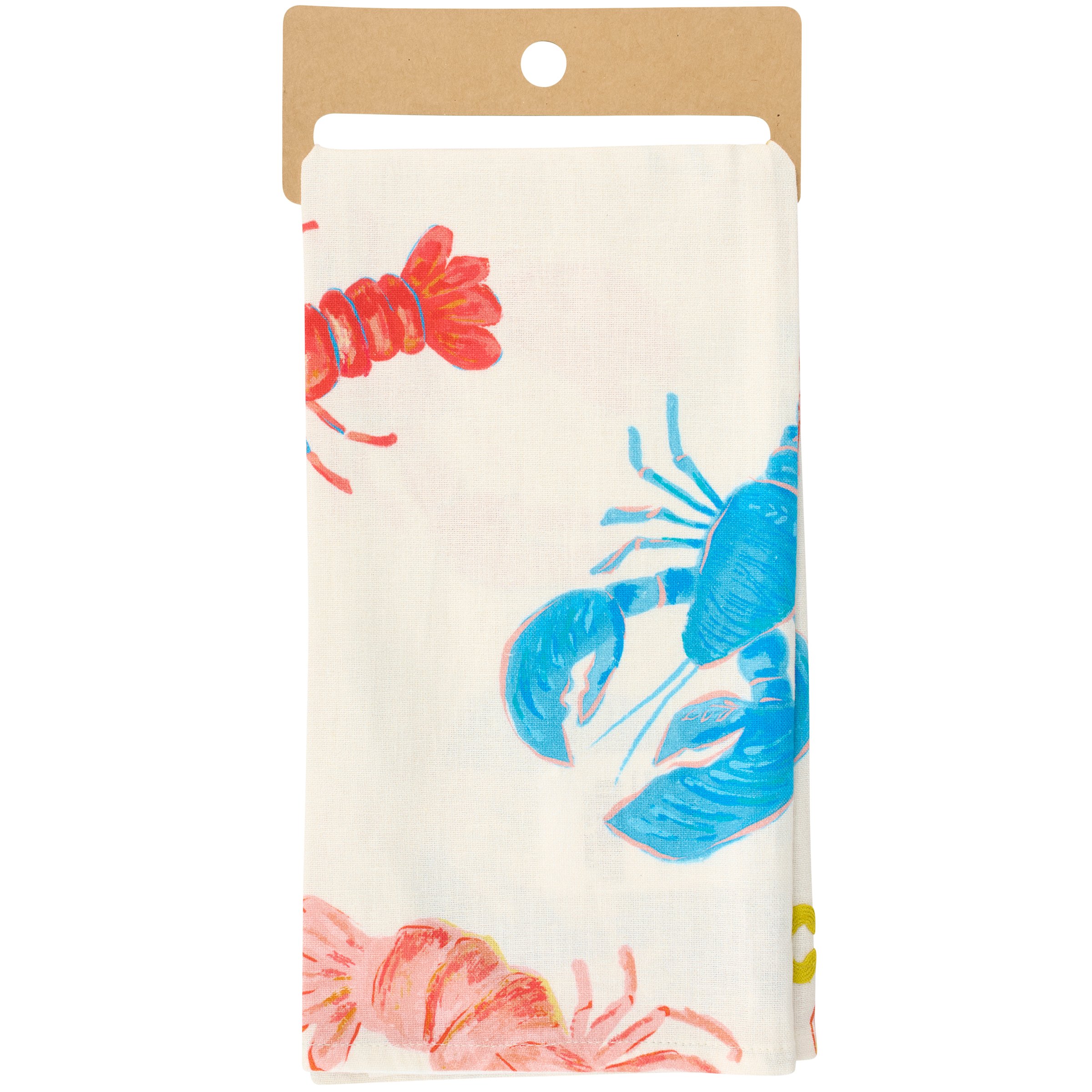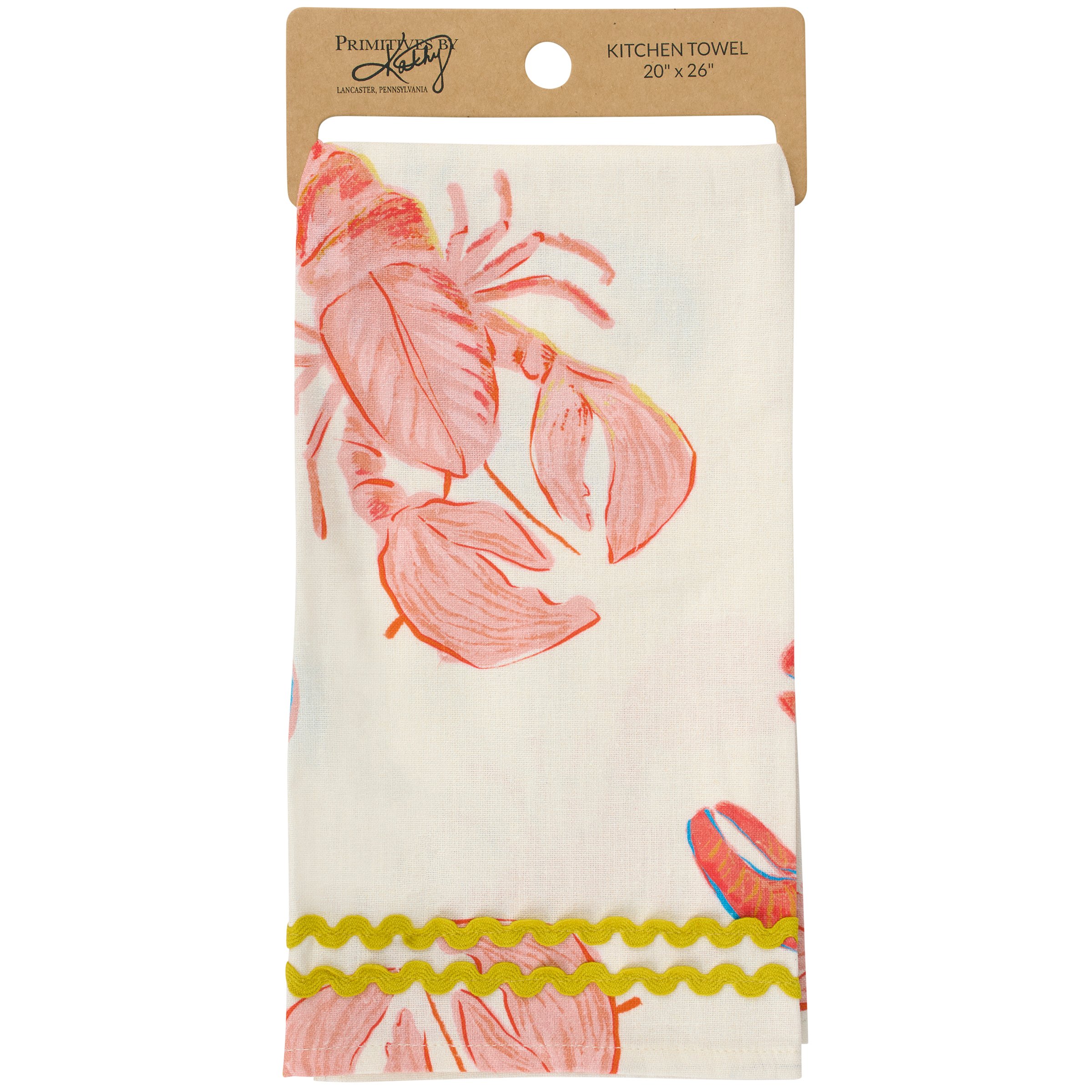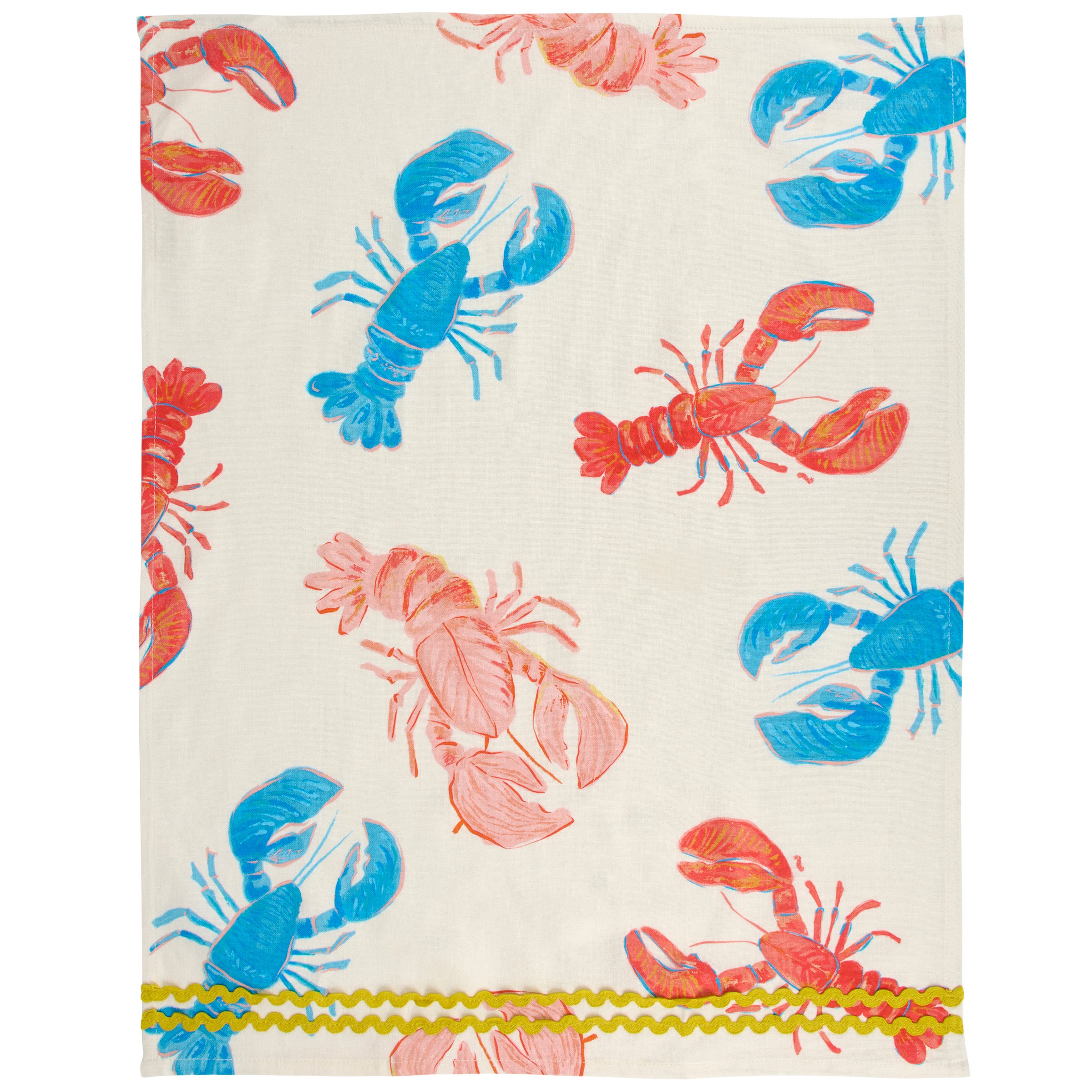 A cotton-linen blend kitchen towel from our Beach Collection featuring an all-over design displaying hand illustrations of lobsters inspired by Italian Coastal style with yellow rickrack accents along the bottom of the towel. Our Lobsters kitchen towel is conveniently machine-washable for easy cleaning. Coastal kitchen towel is packaged on a cardboard hanger with hole to easily display on rack. A beach themed kitchen accessory perfect for everyday use.