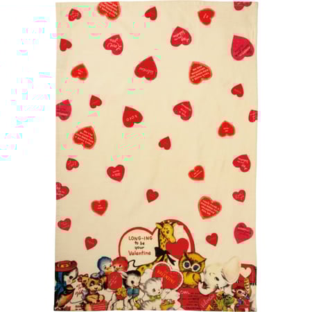 A cotton kitchen towel featuring an all-over heart design and vintage Valentine's Day animal designs with "Long-ing To Be Your Valentine" and various other themed sentiments. Towel is woven with textured slub fabric and features cotton tape loop in corner for hanging. Machine-washable.
