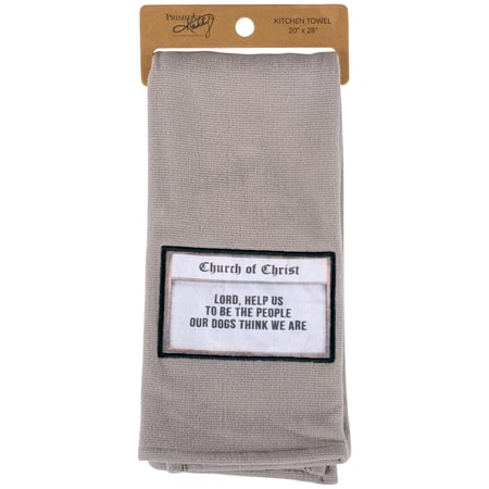 A gray cotton kitchen towel from our Faith Collection featuring a stitched art panel displaying a church sign inspired design with a funny faith sentiment that reads "Lord, Help Us To Be The People Our Dogs Think We Are." Church sign kitchen towel also features a terrycloth layer on the back for added absorbency. Our Lord Help Us kitchen towel is conveniently machine-washable for easy cleaning. Funny faith towel is packaged on a cardboard hanger with hole to easily display on rack. A fun faith-themed kitchen accessory perfect for everyday use.