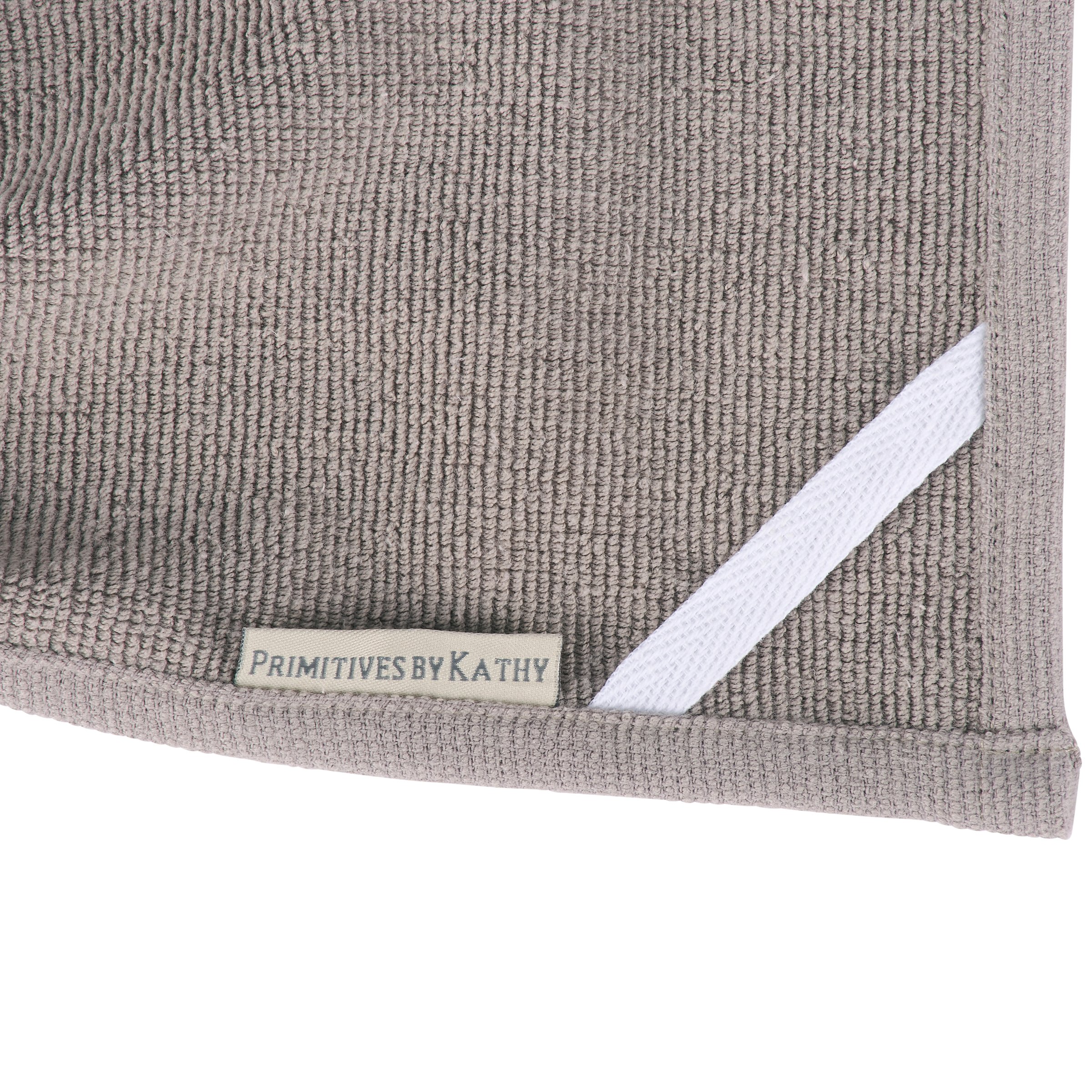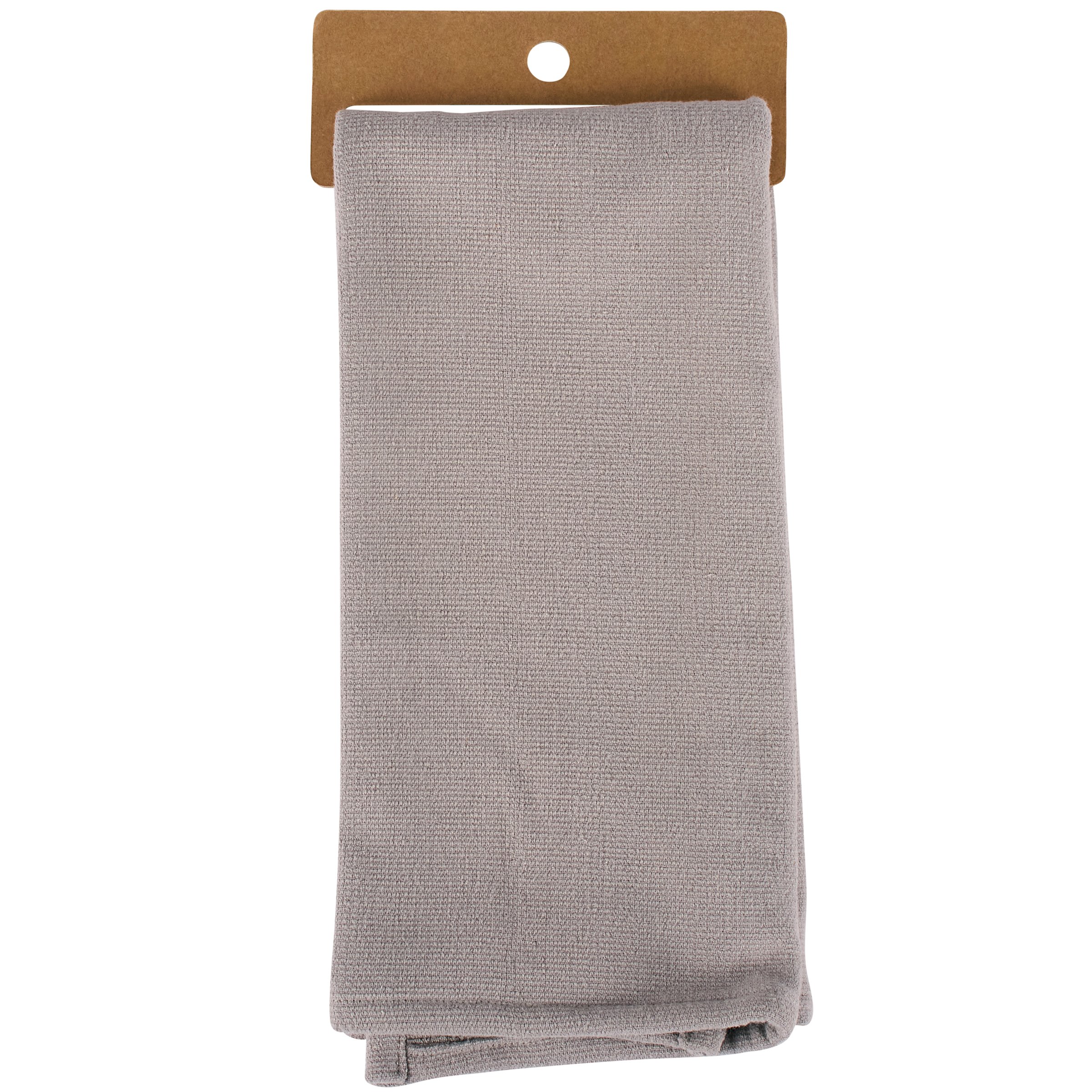 A gray cotton kitchen towel from our Faith Collection featuring a stitched art panel displaying a church sign inspired design with a funny faith sentiment that reads "Lord, Help Us To Be The People Our Dogs Think We Are." Church sign kitchen towel also features a terrycloth layer on the back for added absorbency. Our Lord Help Us kitchen towel is conveniently machine-washable for easy cleaning. Funny faith towel is packaged on a cardboard hanger with hole to easily display on rack. A fun faith-themed kitchen accessory perfect for everyday use.