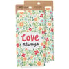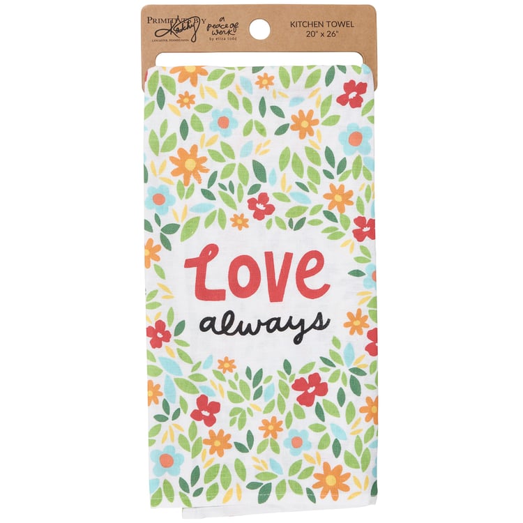 A cotton-linen blend kitchen towel from our Inspiration & Blooms Collection displaying an all-over design of colorful flowers surrounding an inspirational sentiment that reads "Love Always." Our Love Always kitchen towel is conveniently machine-washable for easy cleaning. Packaged on a cardboard hanger with hole to easily display on rack. An inspirational kitchen accessory perfect for everyday use.