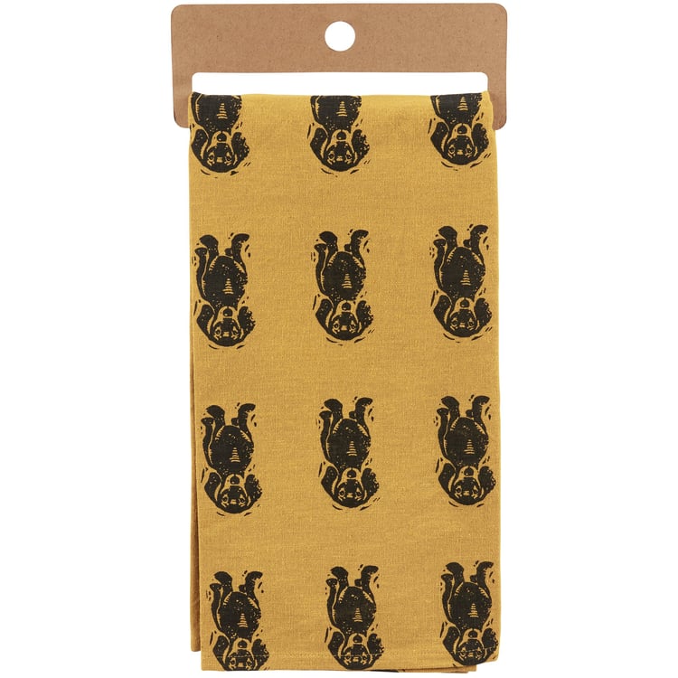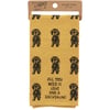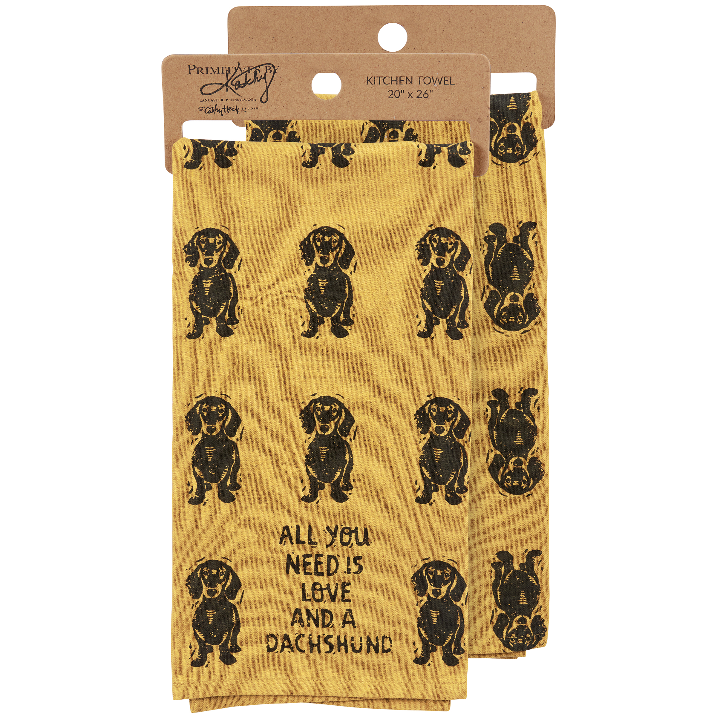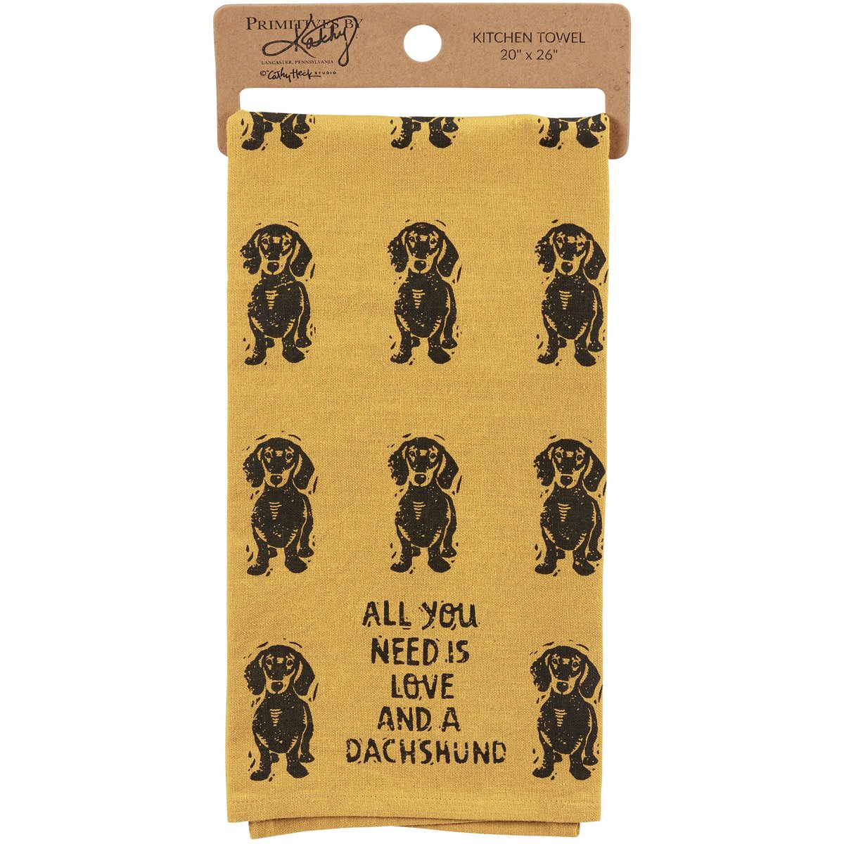 A golden yellow cotton kitchen towel from our Pet Collection displaying unique designs of dachshund all-over the towel with a fun pet inspired sentiment that reads "All You Need Is Love And A Dachshund." Dachshund designs are replicated from block print style art. Our Dachshund kitchen towel is conveniently machine-washable for easy cleaning. Dachshund towel is packaged on a cardboard hanger to easily display on rack. A fun pet-themed kitchen accessory perfect for everyday use.