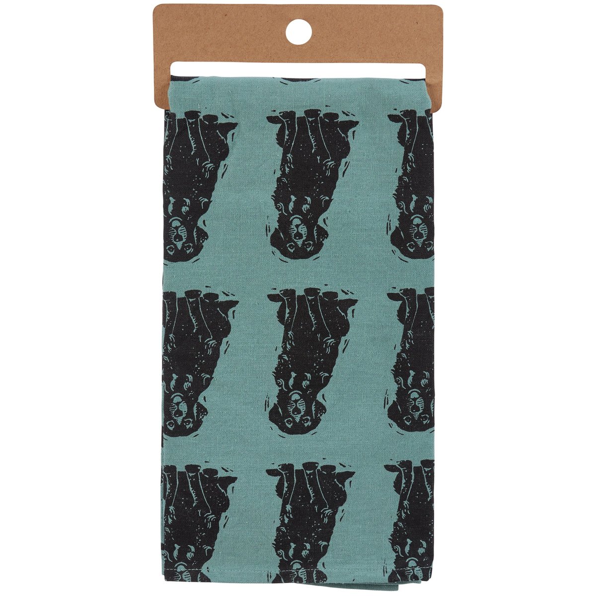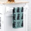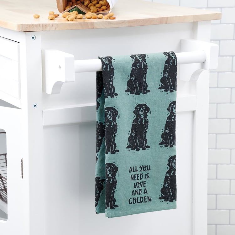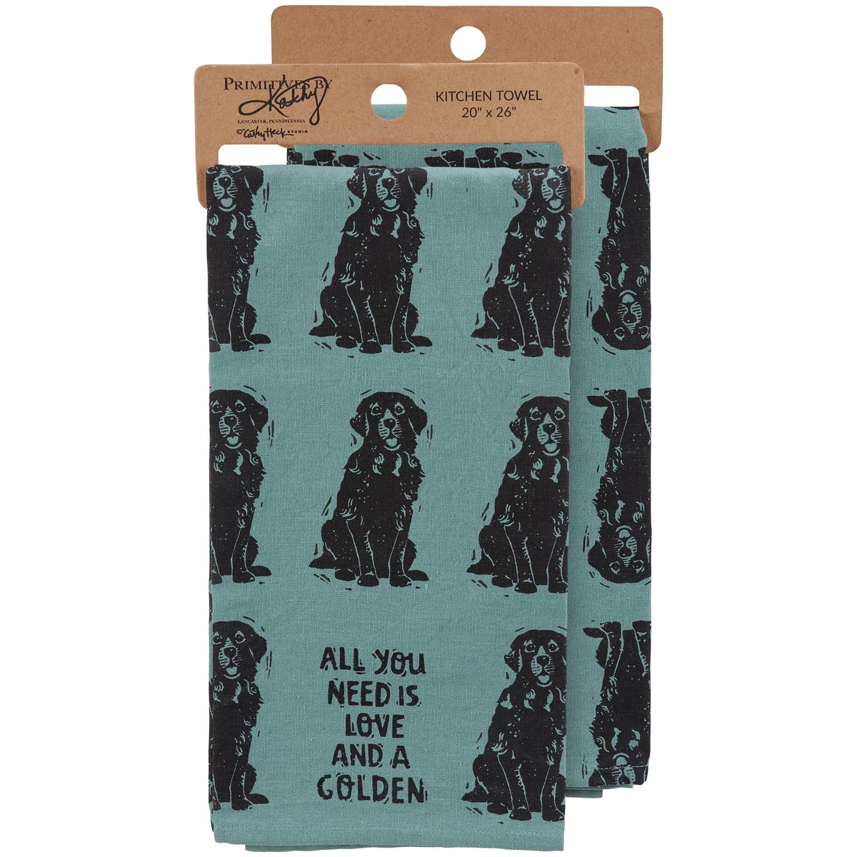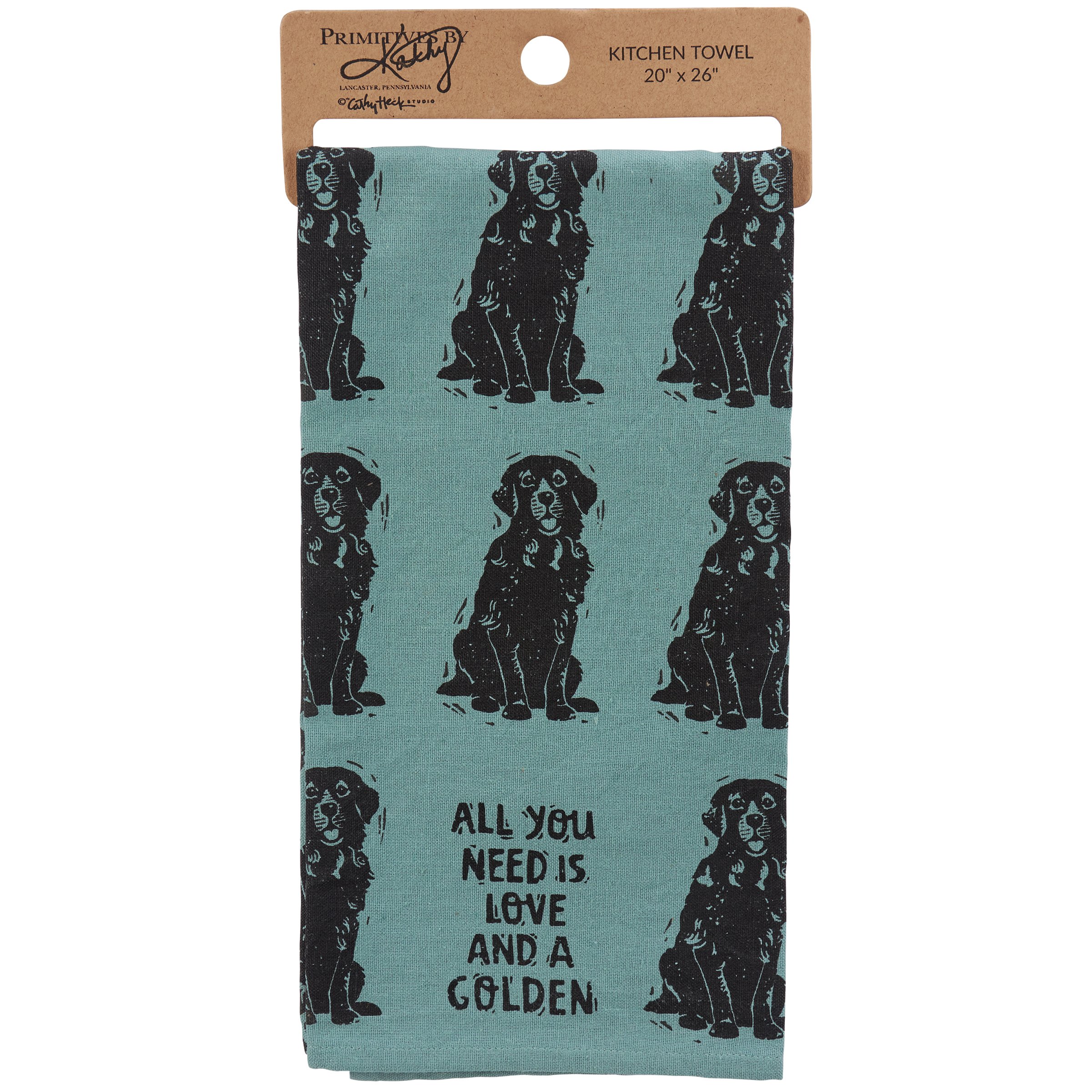 A blue cotton kitchen towel from our Pet Collection displaying unique designs of golden retrievers all-over the towel with a fun pet inspired sentiment that reads "All You Need Is Love And A Golden." Golden retriever designs are replicated from block print style art. Our Golden kitchen towel is conveniently machine-washable for easy cleaning. Golden retriever towel is packaged on a cardboard hanger to easily display on rack. A fun pet-themed kitchen accessory perfect for everyday use.