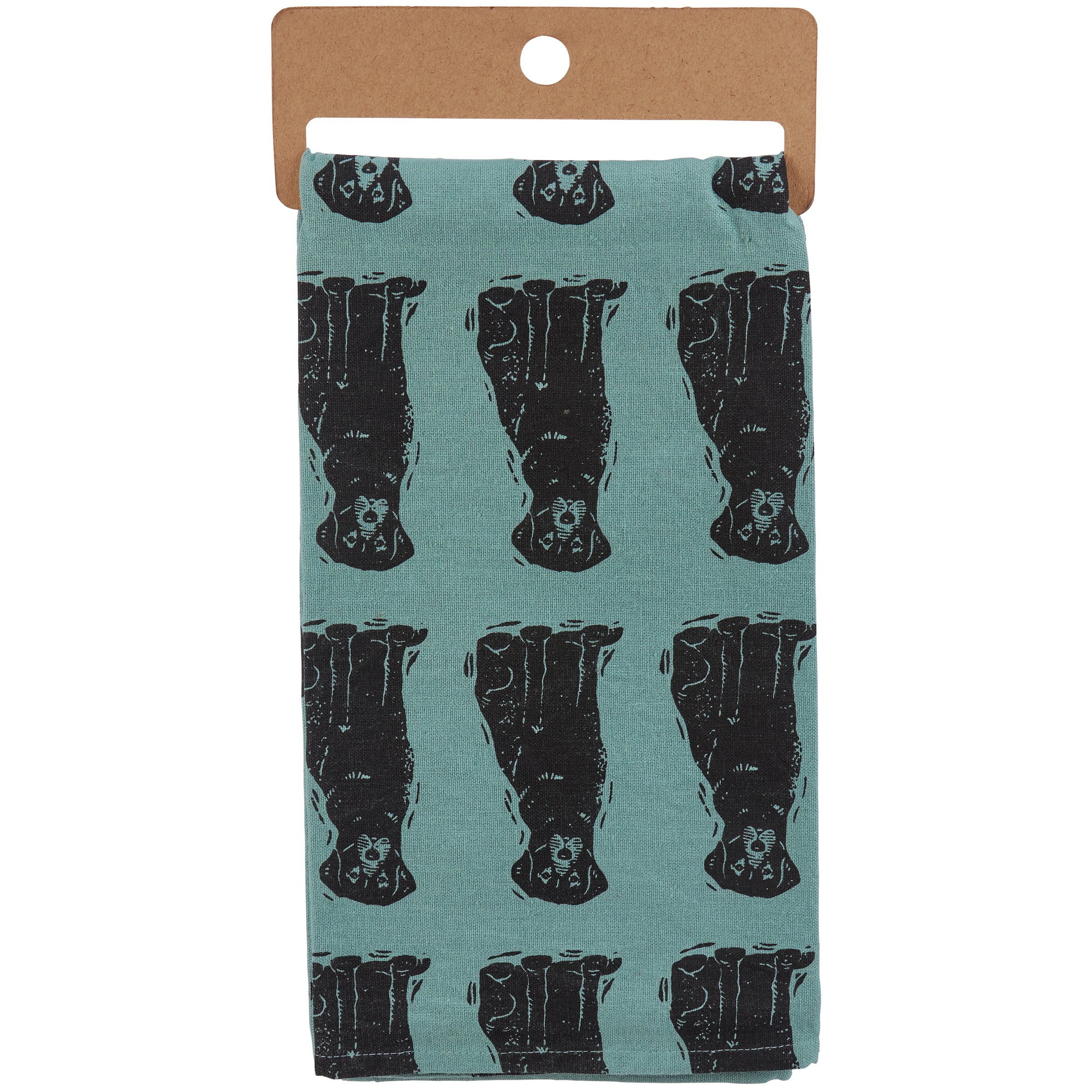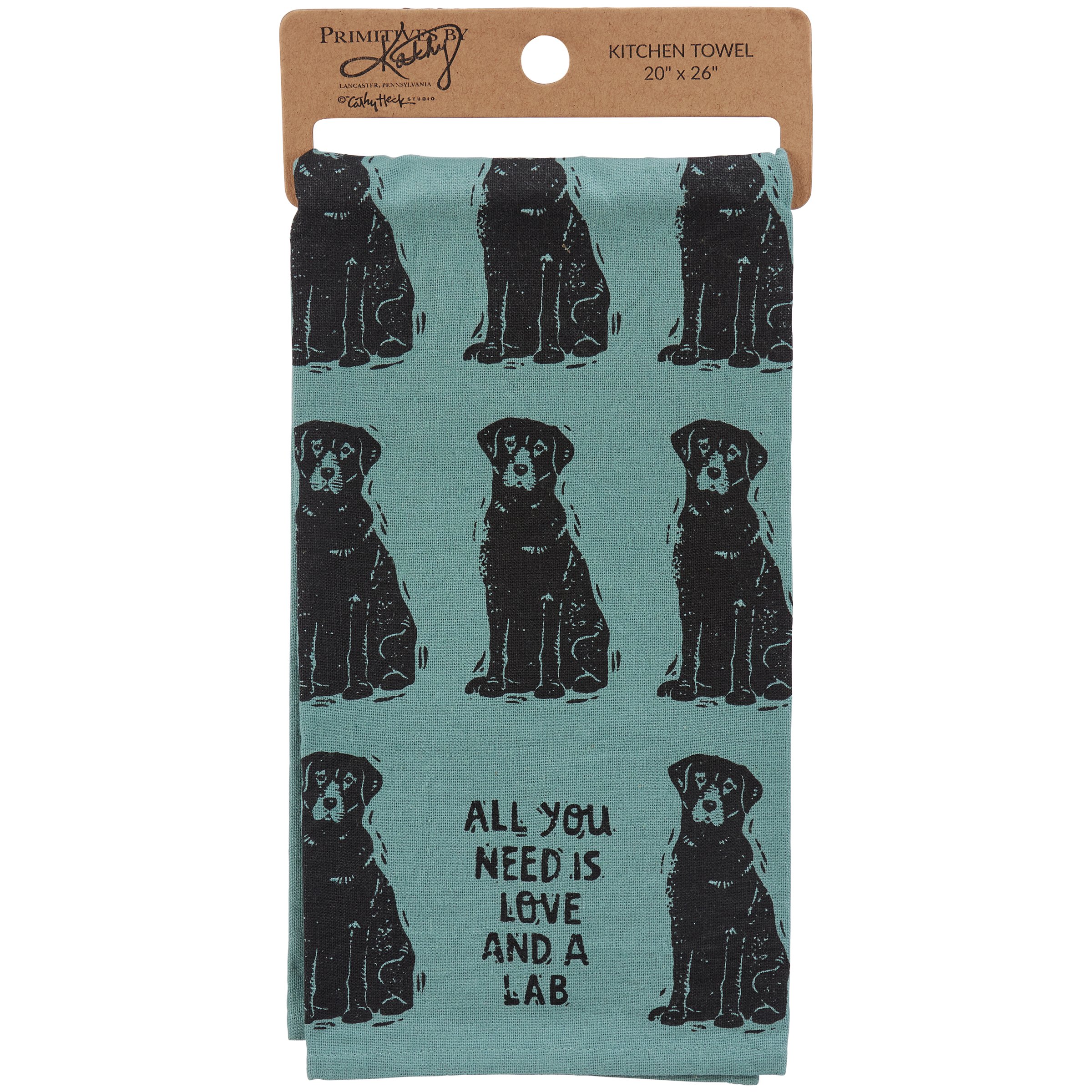 A blue cotton kitchen towel from our Pet Collection displaying unique designs of labradors all-over the towel with a fun pet inspired sentiment that reads "All You Need Is Love And A Lab." Labrador designs are replicated from block print style art. Our Labrador kitchen towel is conveniently machine-washable for easy cleaning. Labrador towel is packaged on a cardboard hanger to easily display on rack. A fun pet-themed kitchen accessory perfect for everyday use.