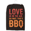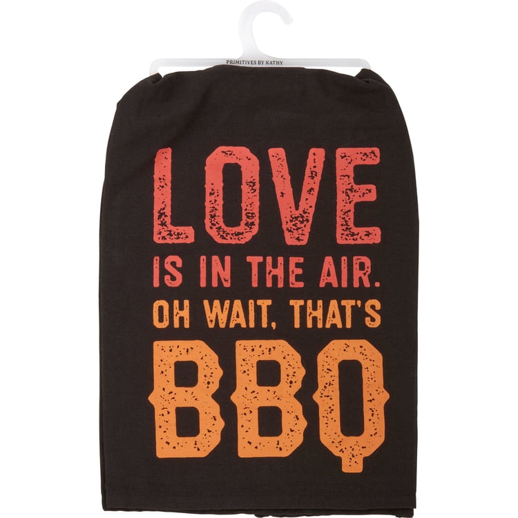 A black cotton kitchen towel from our Grilling & Chilling Collection displaying a humorous "Love Is In The Air. Oh Wait, That's BBQ." sentiment with distressed details. Our Love Is In The Air kitchen towel is machine-washable for convenient cleaning. Packaged on a plastic hanger with hook to easily hang on rack.