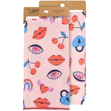 A cotton kitchen towel from our Valentine's Day Collection displaying a pattern of stylish love-themed icons in a bold seasonal color palette. Valentine's Day towel features a red pom trim for added interest. Our Love Locks kitchen towel is conveniently machine-washable for easy cleaning. Seasonal towel is packaged on a cardboard hanger with hole to easily display on rack. A stylish love-themed kitchen accessory perfect for seasonal use.