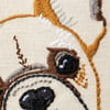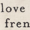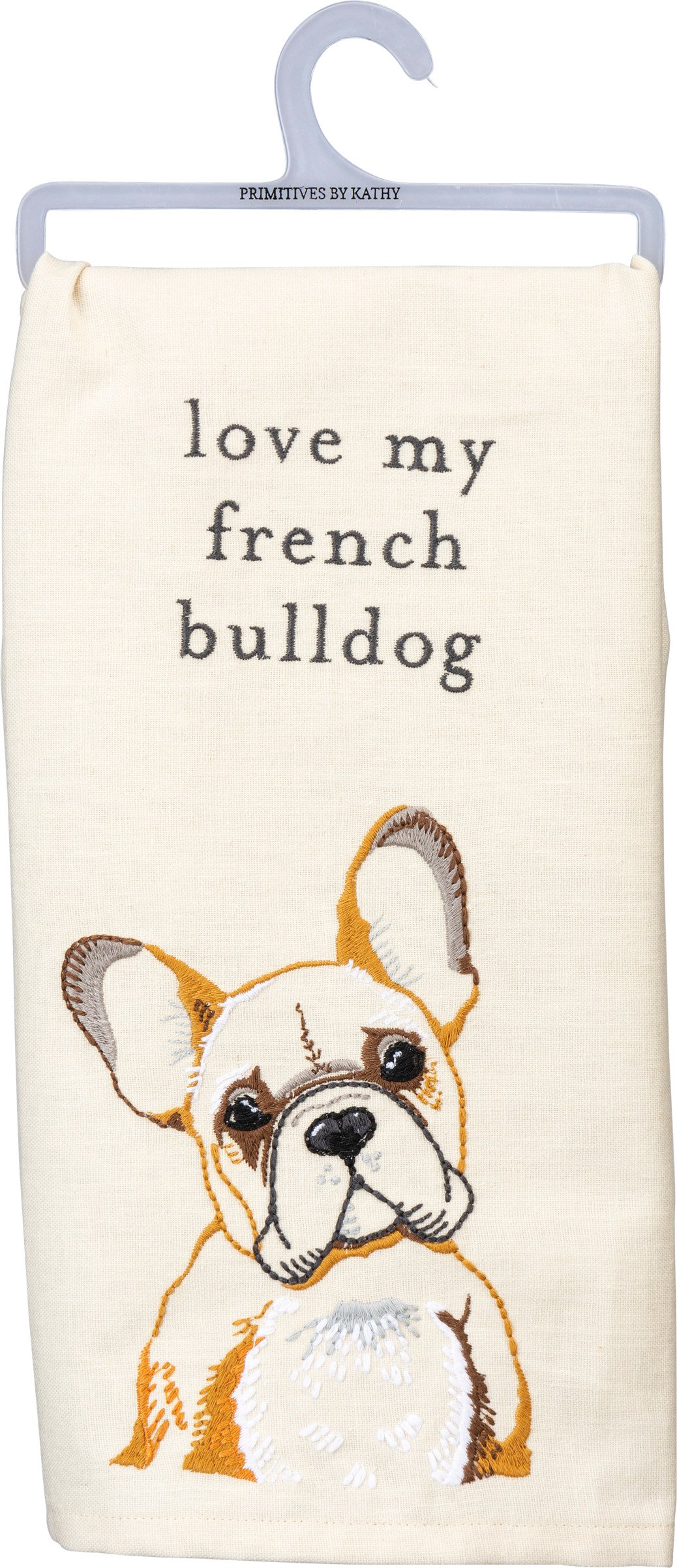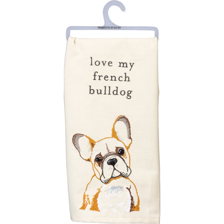 A cotton-linen blend kitchen towel from our Pet Collection displaying a beautifully embroidered design of a french bulldog and coordinating sentiment that reads "Love My French Bulldog." Our Love My French Bulldog kitchen towel is conveniently machine-washable for easy cleaning. Bulldog kitchen towel is packaged on a clear plastic hanger to easily display on rack. A lovely pet-themed kitchen accessory perfect for everyday use.