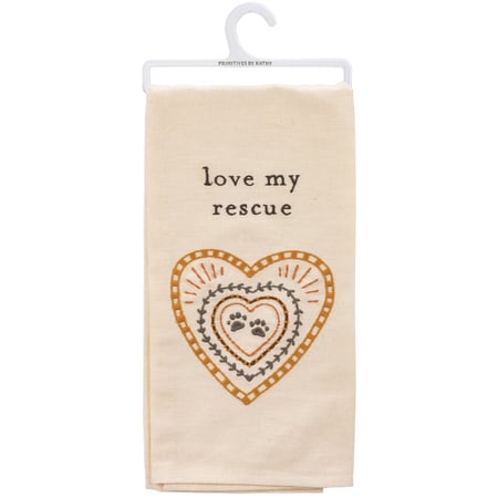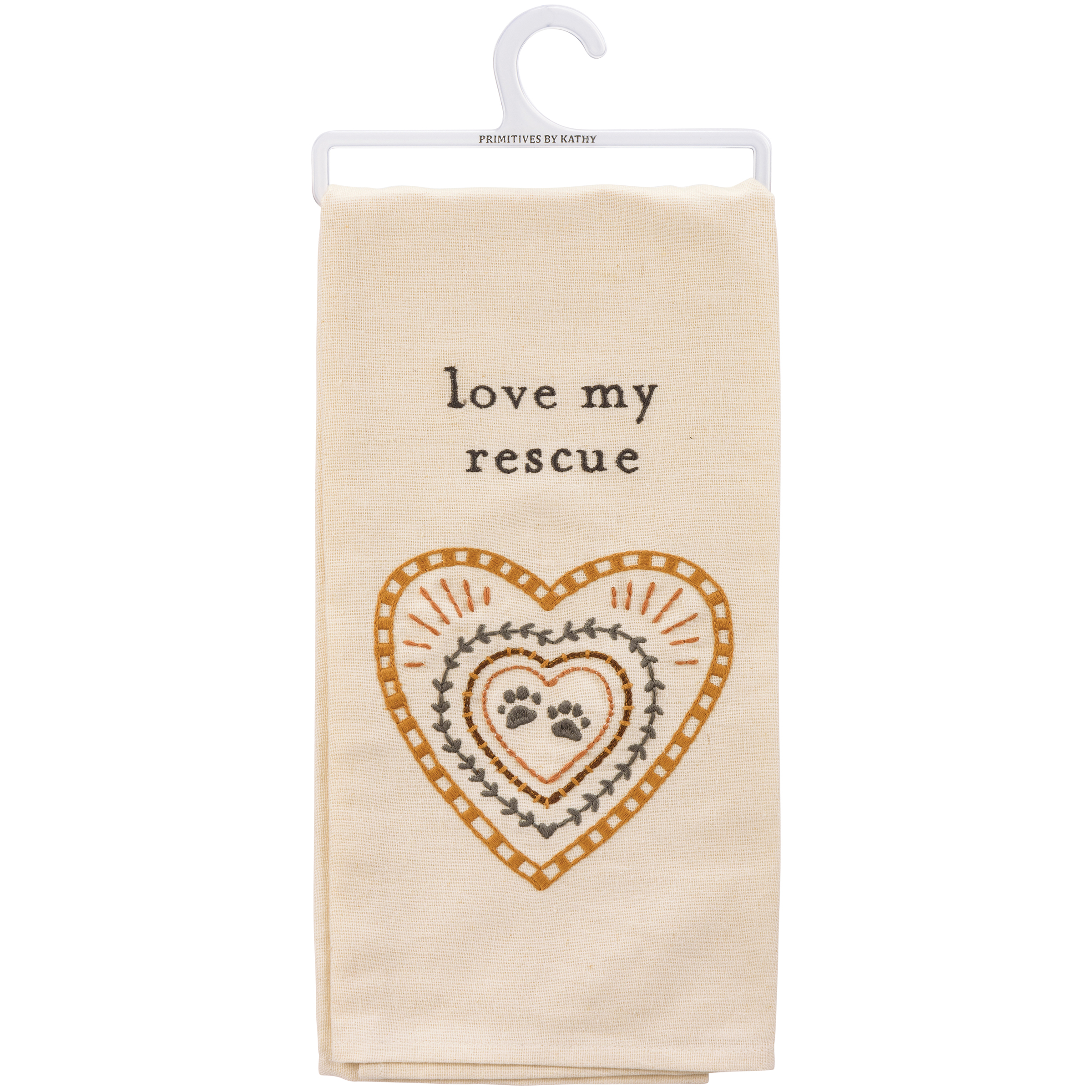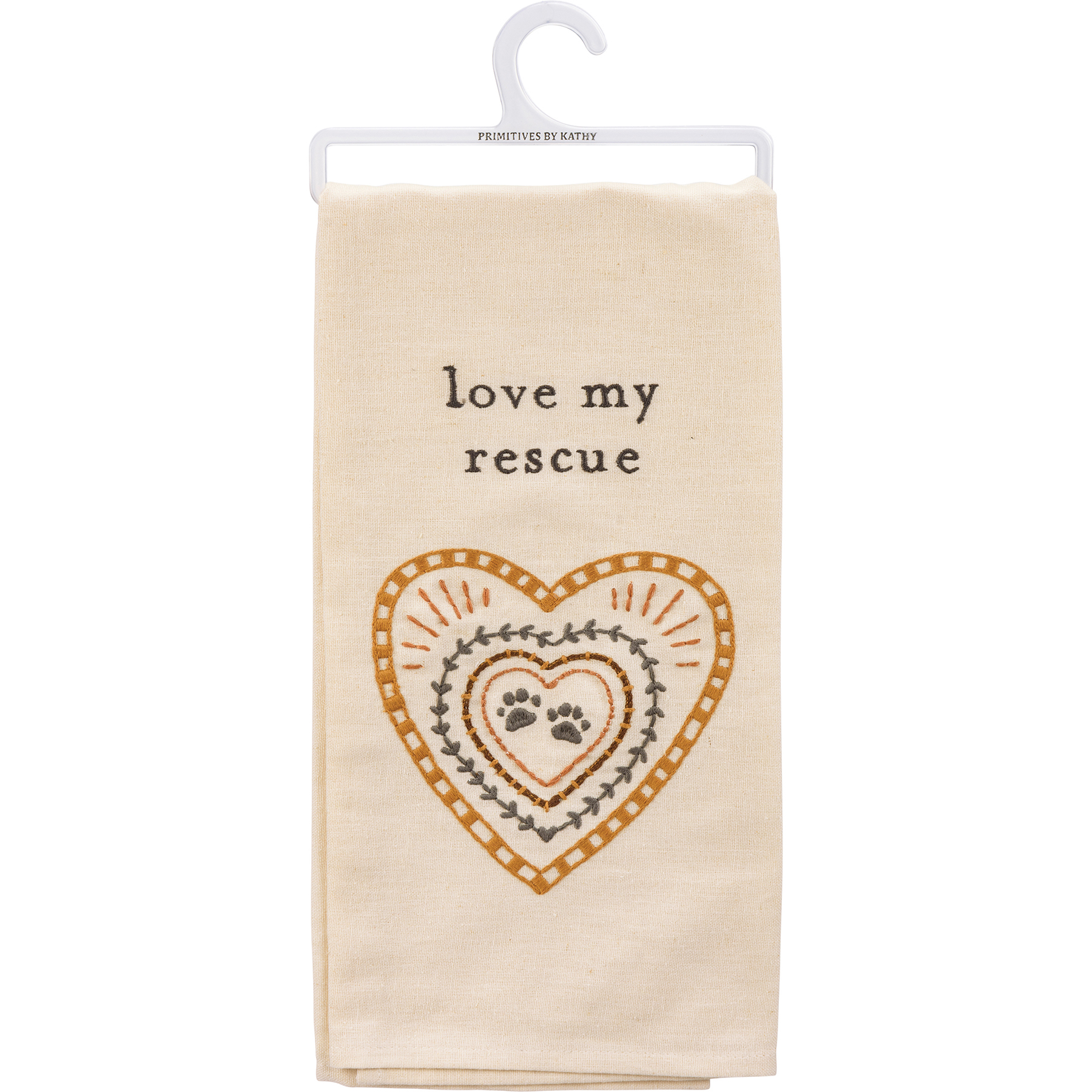 A cotton linen blend kitchen towel featuring a stitched art panel with embroidered "Love My Rescue" sentiment and heart with paw prints design. Our Love My Rescue kitchen towel is machine-washable.