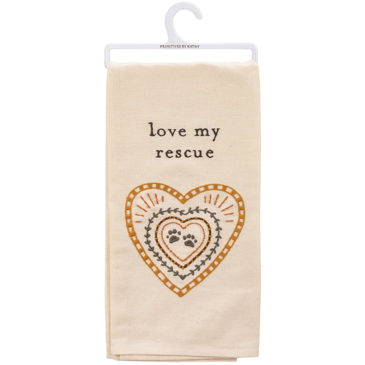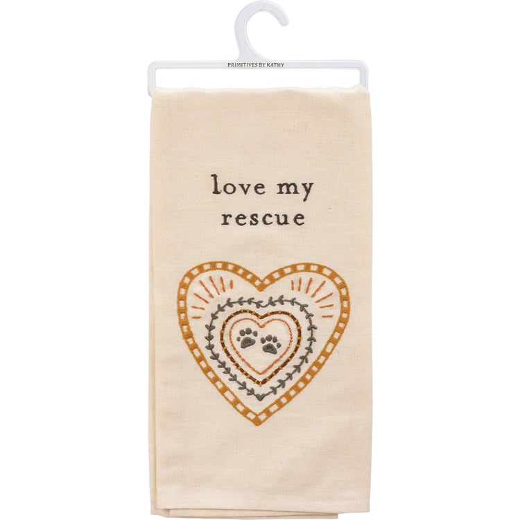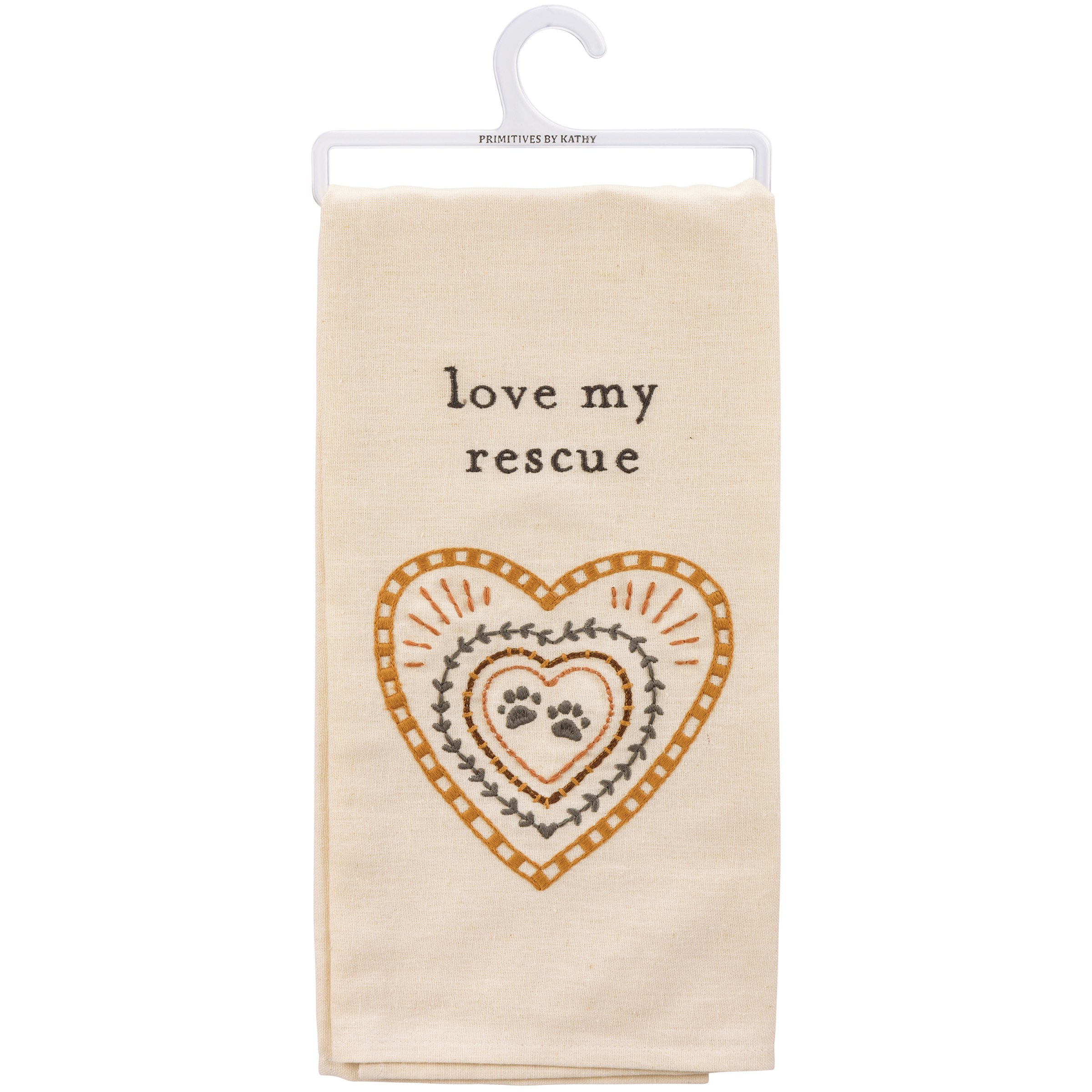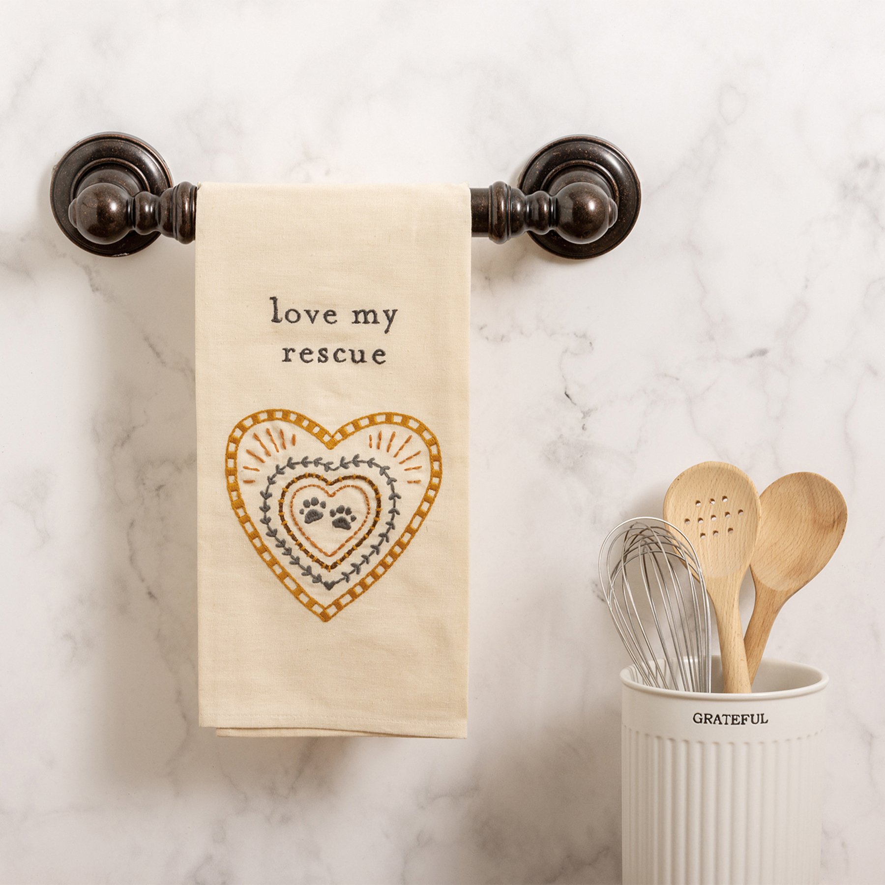 A cotton linen blend kitchen towel featuring a stitched art panel with embroidered "Love My Rescue" sentiment and heart with paw prints design. Our Love My Rescue kitchen towel is machine-washable.