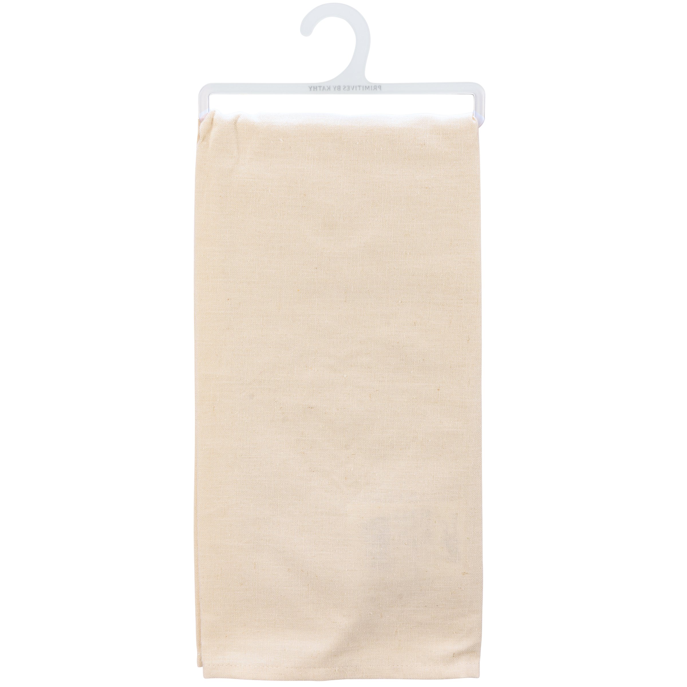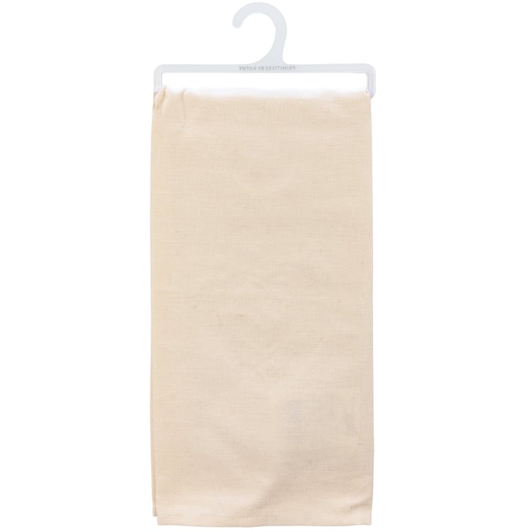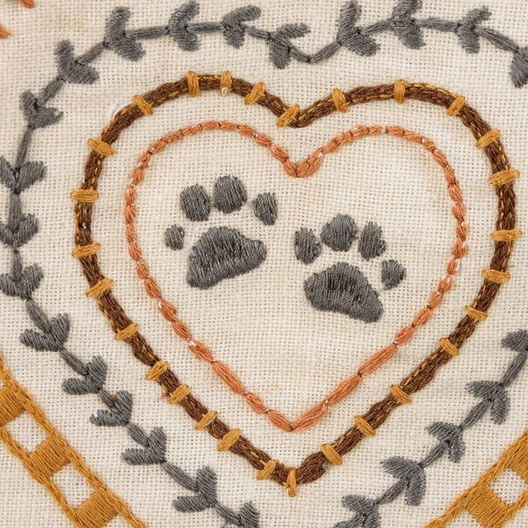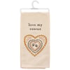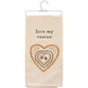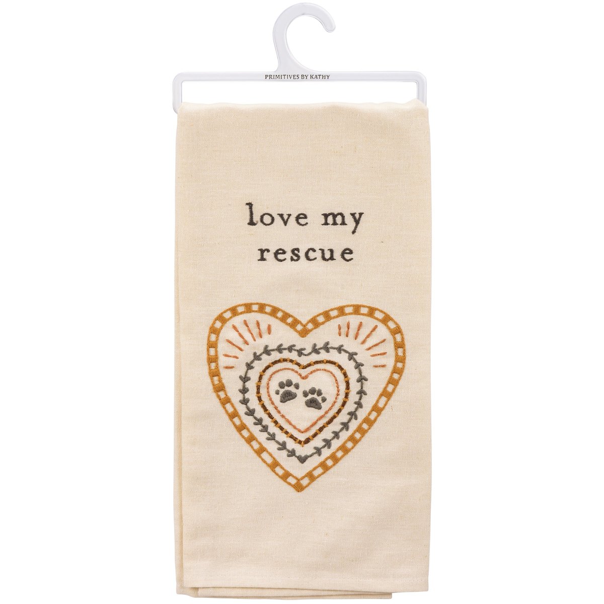 A cotton linen blend kitchen towel featuring a stitched art panel with embroidered "Love My Rescue" sentiment and heart with paw prints design. Our Love My Rescue kitchen towel is machine-washable.