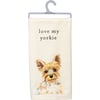 A cotton-linen blend kitchen towel from our Pet Collection displaying a beautifully embroidered design of a yorkie and coordinating sentiment that reads "Love My Yorkie." Our Love My Yorkie kitchen towel is conveniently machine-washable for easy cleaning. Yorkie kitchen towel is packaged on a clear plastic hanger to easily display on rack. A lovely pet-themed kitchen accessory perfect for everyday use.