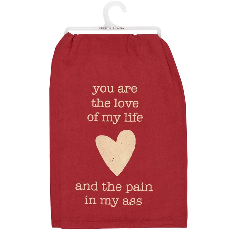 A red cotton kitchen towel from our Valentine's Day Collection displaying a rustic inspired design of a heart and a fun love-themed sentiment that reads "You Are The Love Of My Life - And The Pain In My Ass." Our Love Of My Life kitchen towel is machine-washable for convenient cleaning. Packaged on a clear plastic hanger to easily display on rack. A fun Valentine's Day kitchen accessory perfect for seasonal use or gifting.