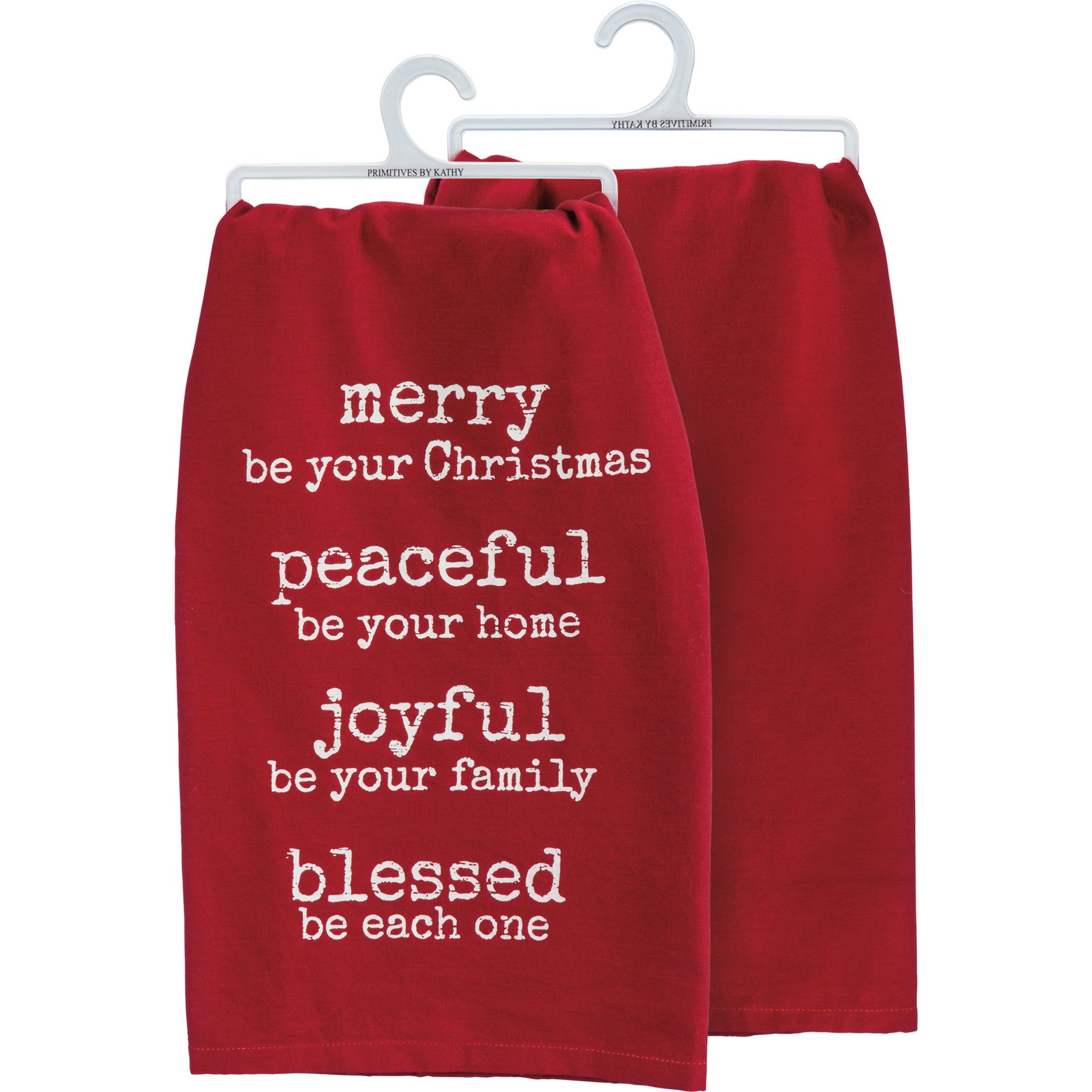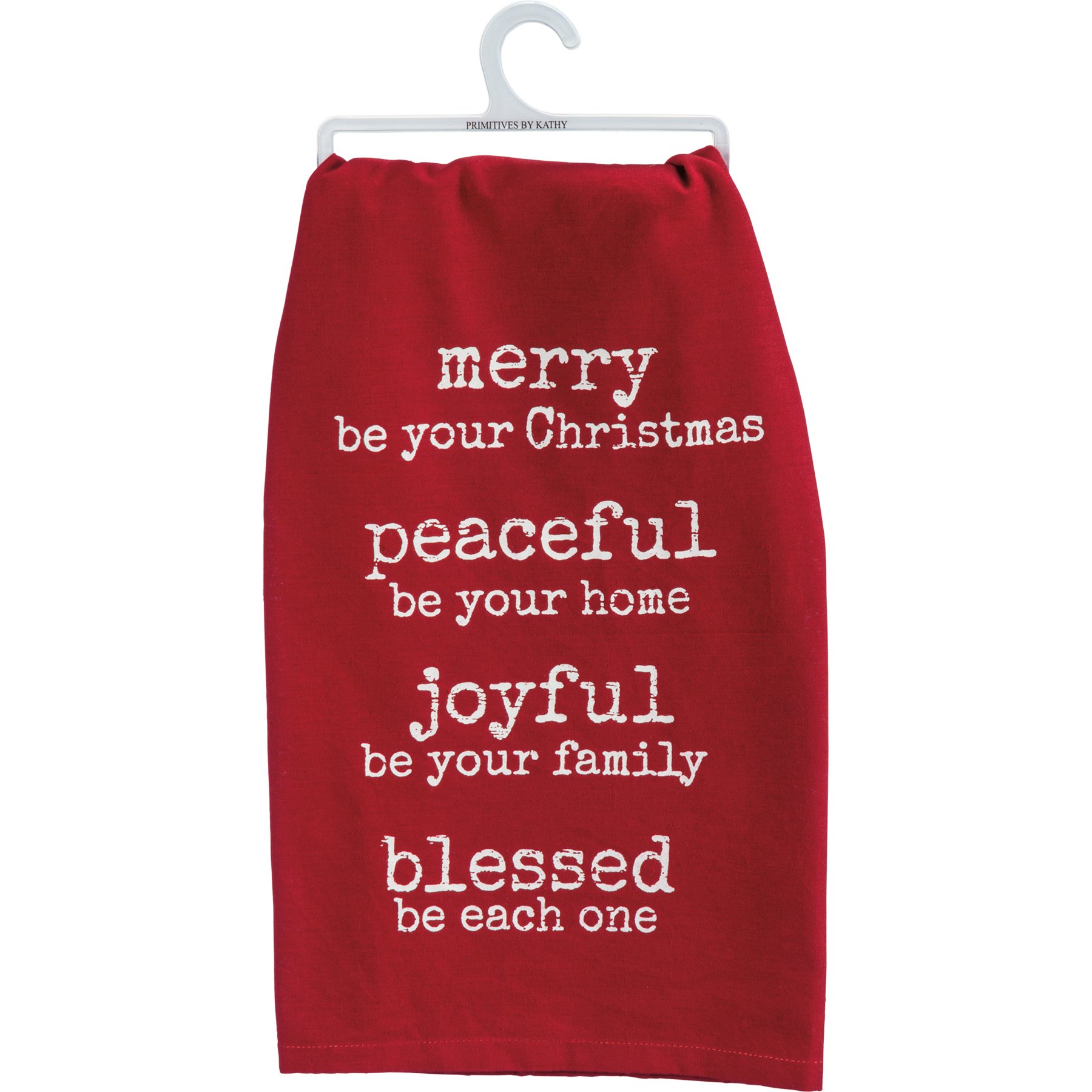 A cotton kitchen towel featuring a distressed "Merry Be Your Christmas Peaceful Be Your Home Joyful Be Your Family Blessed Be Each One" sentiment. Complements well with existing decor or coordinating designs. Machine-washable.