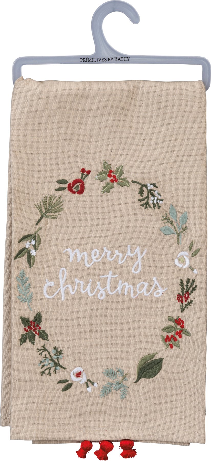 A fresh update for Christmas, this linen blend kitchen towel from our Christmas Collection features an embroidered "Merry Christmas" sentiment and wreath design in a holiday-inspired palette. Our Merry Christmas Embroidered kitchen towel complements well with coordinating styles for a cohesive collection. Machine-washable.