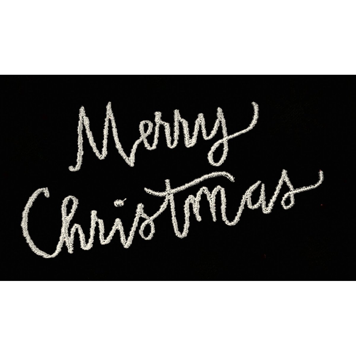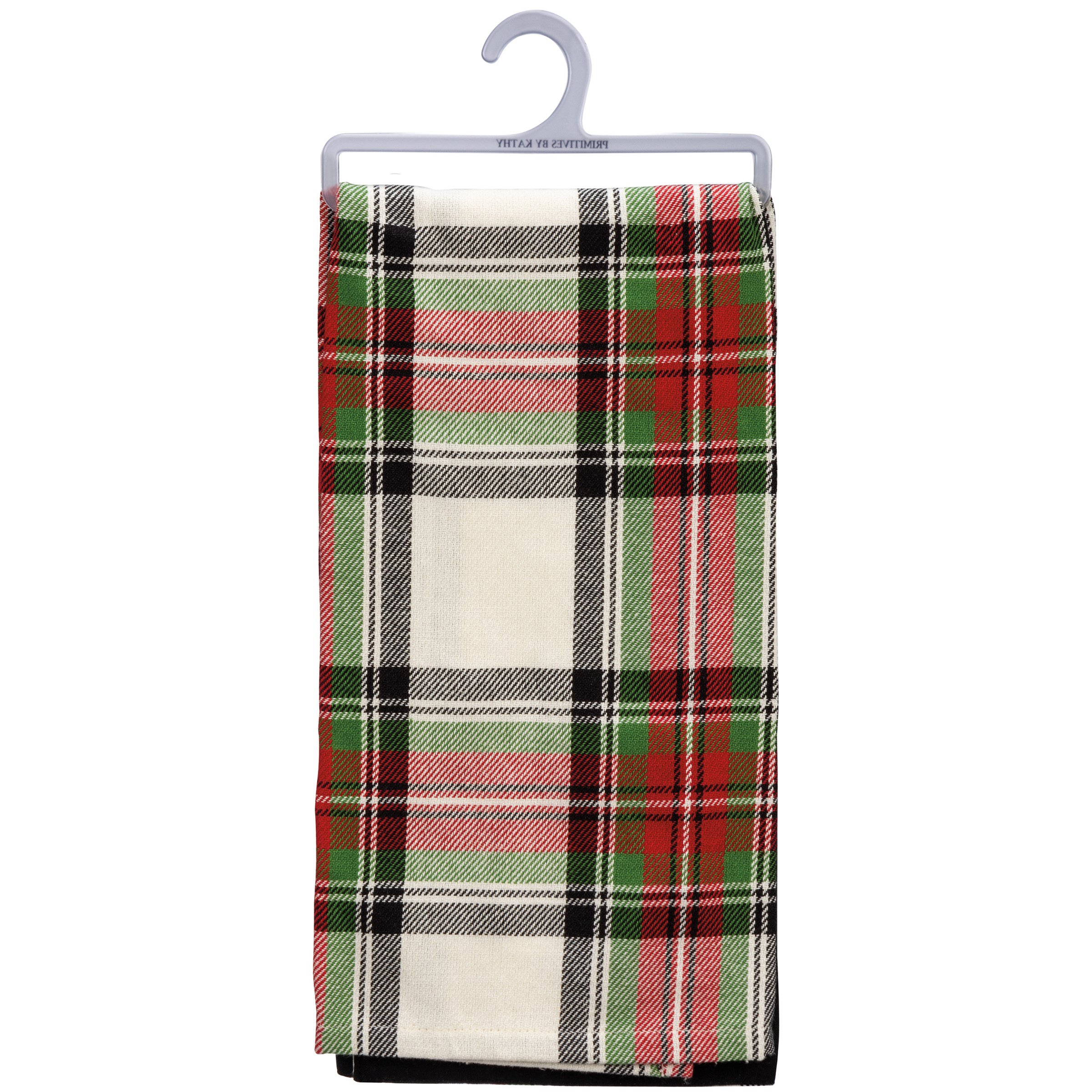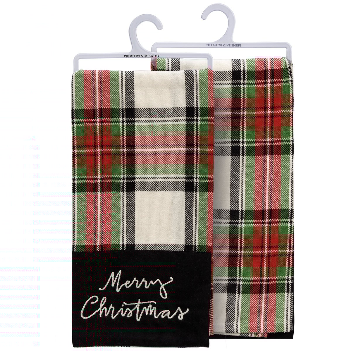 A cotton kitchen towel with an all-over holiday plaid pattern and an embroidered, hand lettered "Merry Christmas" sentiment on a black panel at the bottom. Machine-washable.