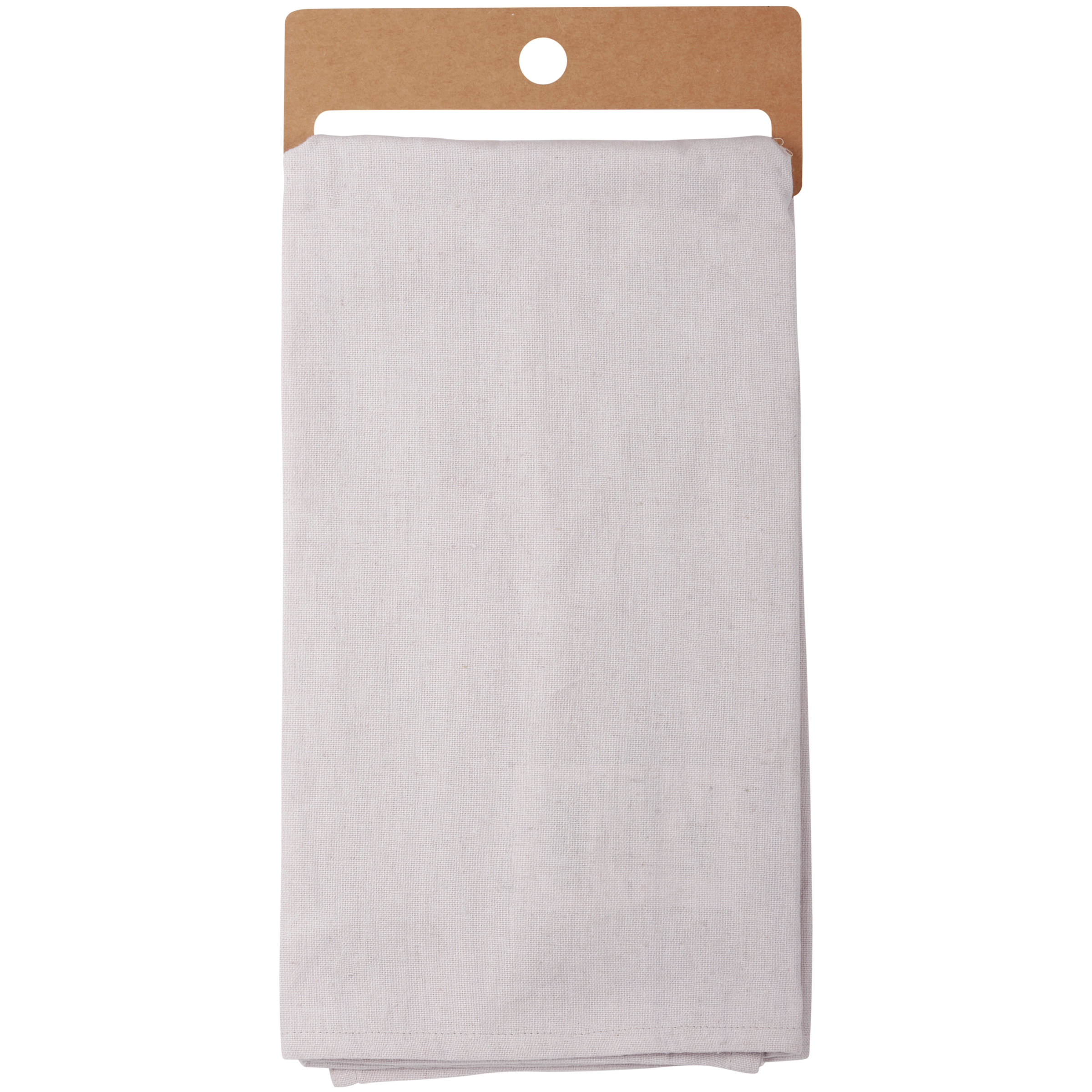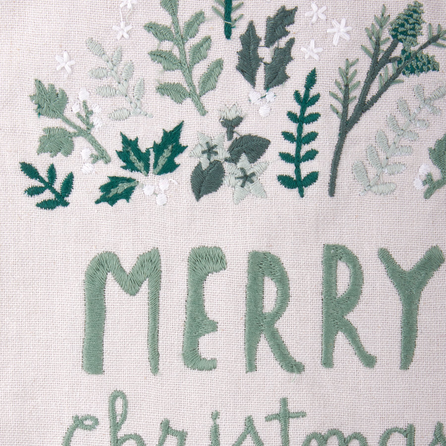 A cotton-linen blend kitchen towel from our Christmas Collection displaying a natural holiday design of winter greens surrounding a "Merry Christmas" sentiment. Design and sentiment are embroidered for added texture. Packaged on a cardboard hanger with hole to easily hang on rack. The Merry Christmas Greens kitchen towel is machine-washable.