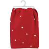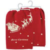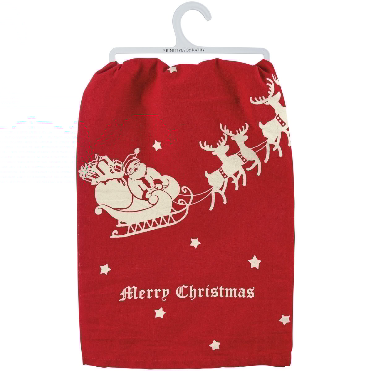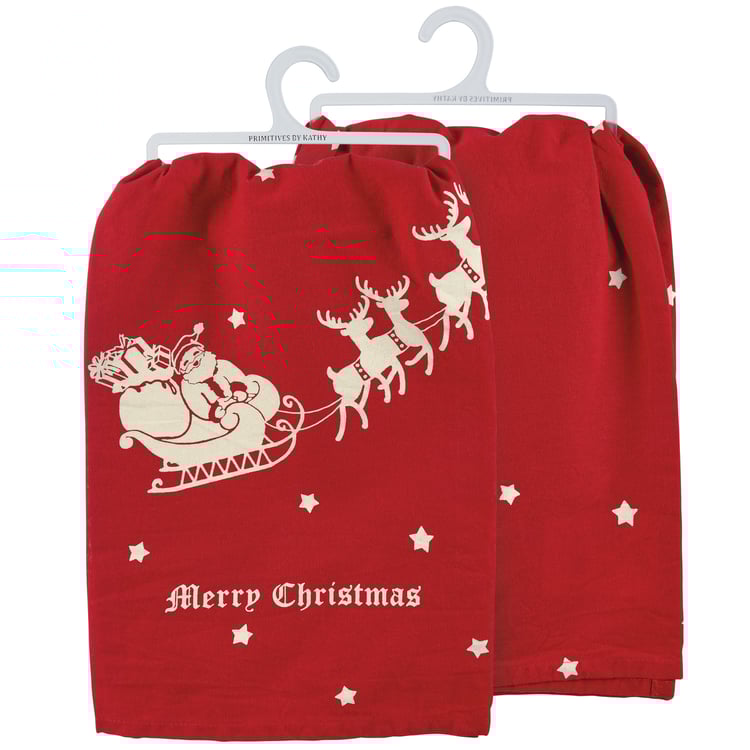 A red cotton kitchen towel from our Christmas Collection displaying a rustic design of Santa riding in a sleigh with "Merry Christmas" sentiment and all-over star designs. Our Merry Christmas kitchen towel is machine-washable for convenient cleaning. Packaged on a clear plastic hanger to easily display on rack. A rustic and functional seasonal kitchen accent.
