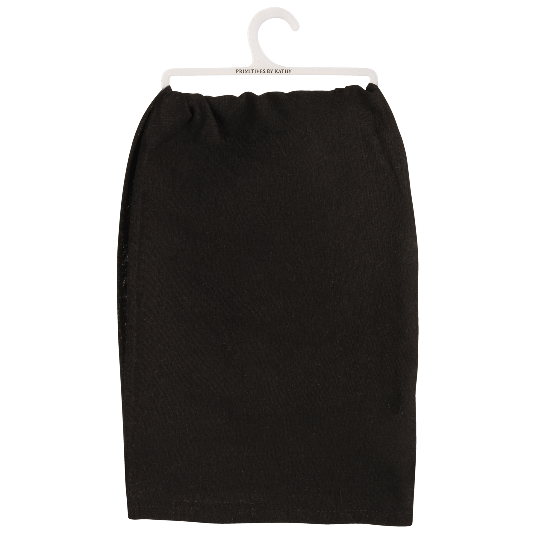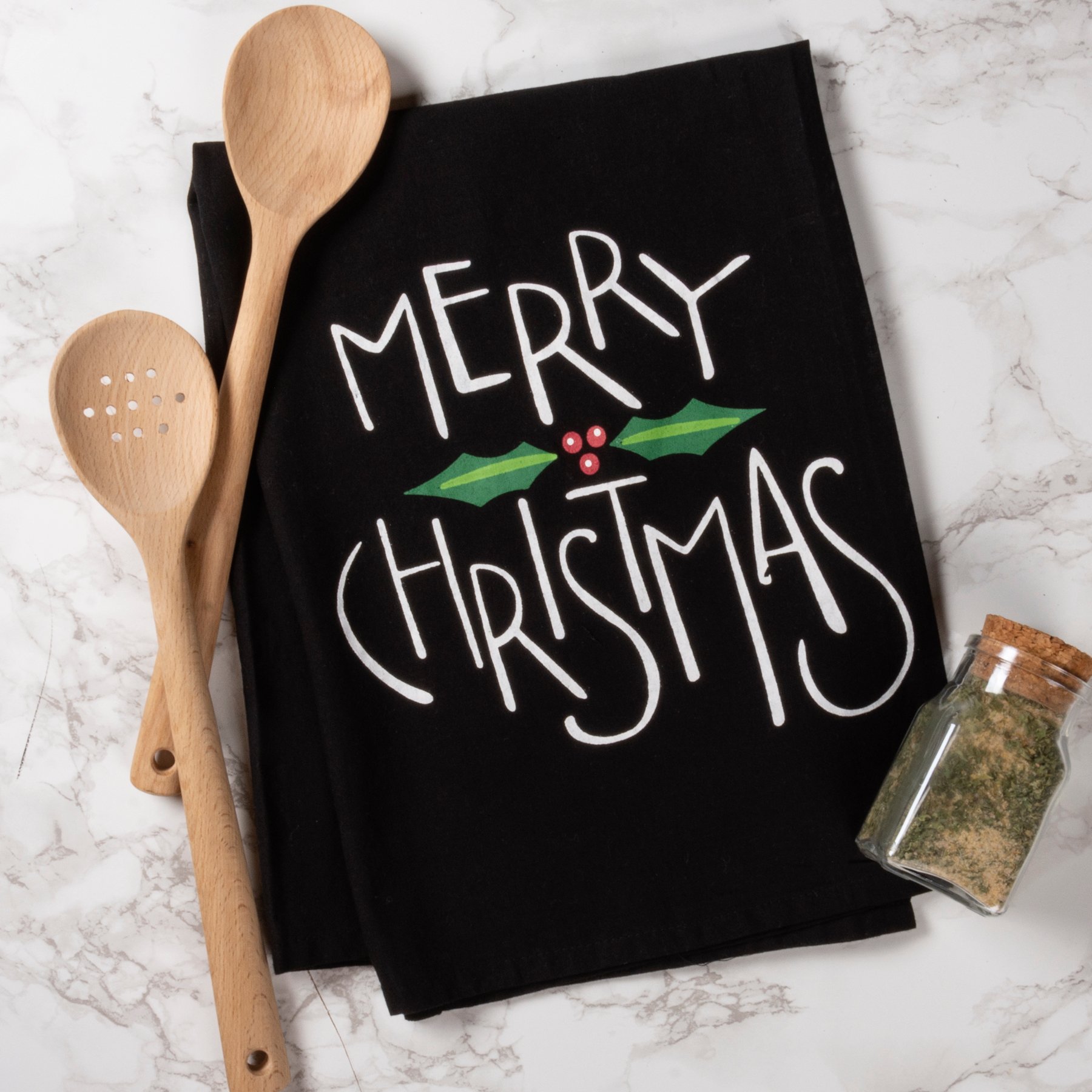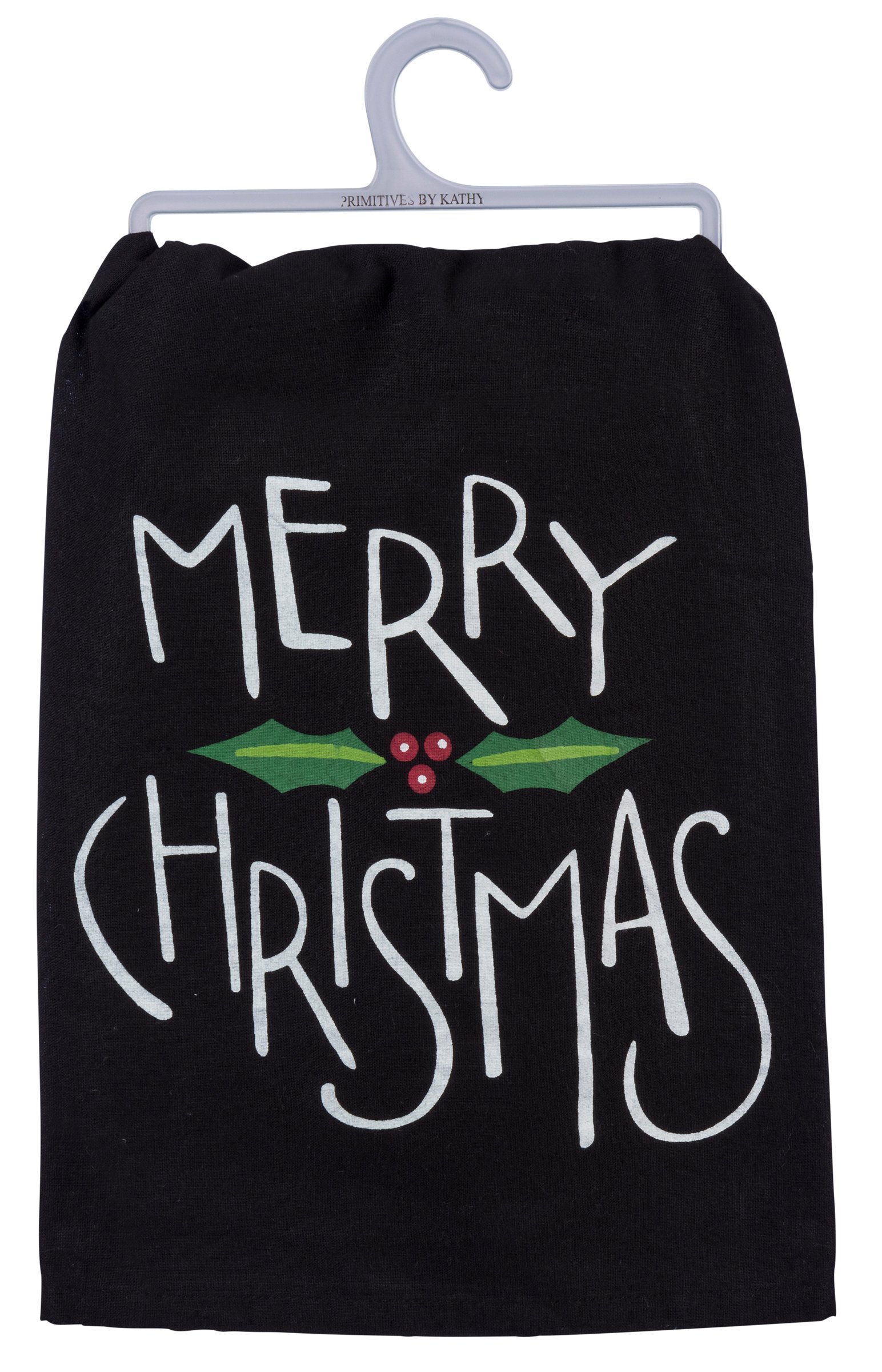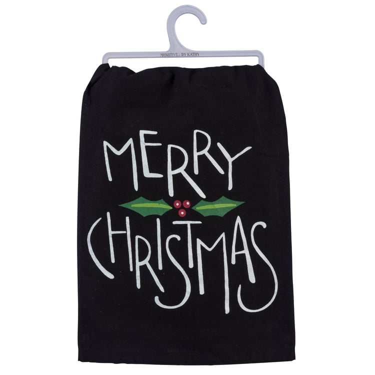 Perfect for the holidays, a black cotton kitchen towel from our Christmas Collection featuring a "Merry Christmas" sentiment with holly design. This black Merry Christmas Holly kitchen towel is conveniently machine-washable for easy cleaning. Seasonal kitchen towel is packaged on a clear plastic hanger to easily display on rack.