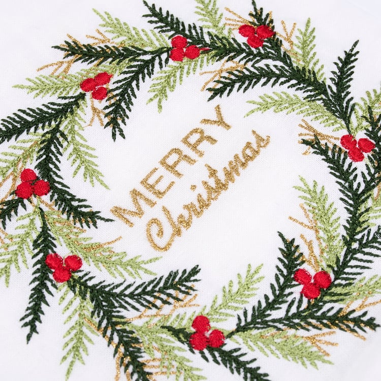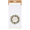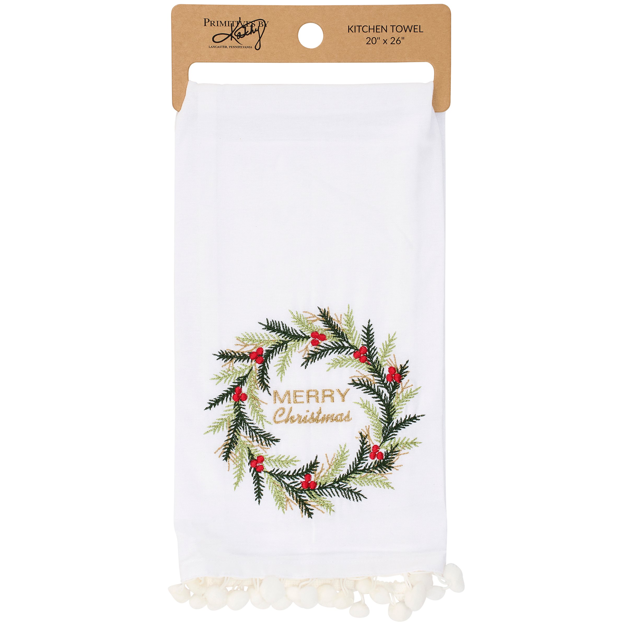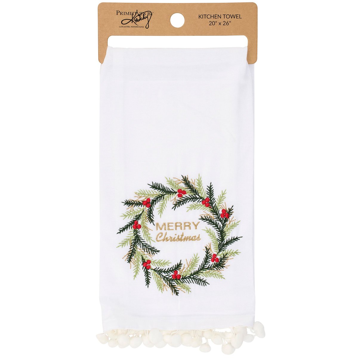 A white cotton kitchen towel from our Christmas Collection displaying a fully embroidered Christmas wreath design with "Merry Christmas" sentiment in the center and metallic gold thread accents throughout. Christmas kitchen towel features a complementing cream pom trim for added interest. Our Merry Christmas Wreath kitchen towel is conveniently machine-washable for easy cleaning. Seasonal kitchen towel is packaged on a cardboard hanger with hole to easily display on rack. A stylish Christmas kitchen accessory perfect for seasonal use.