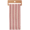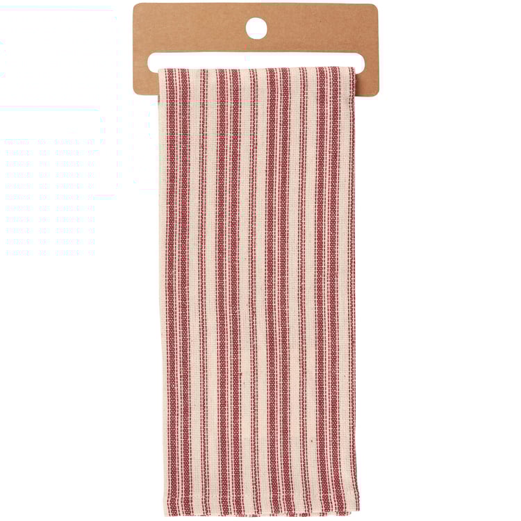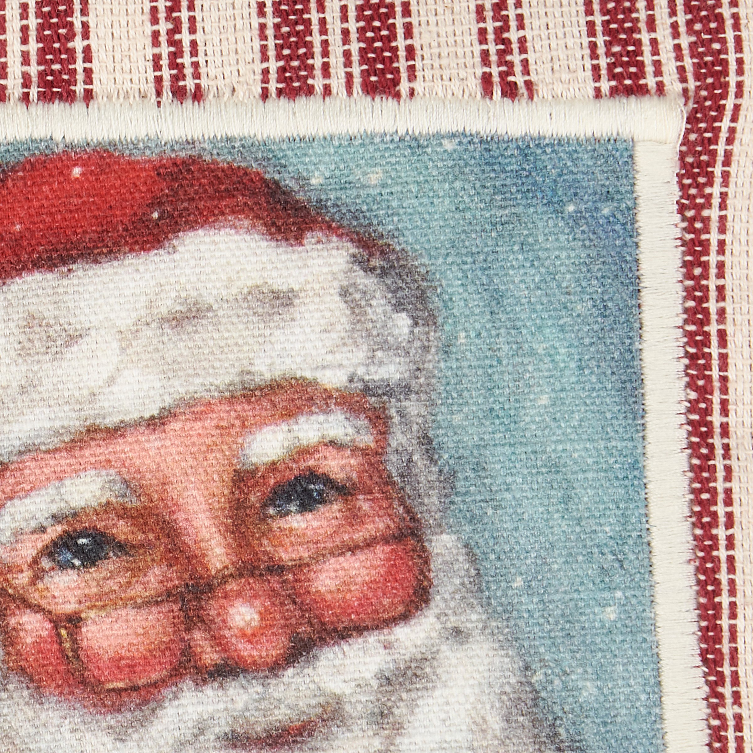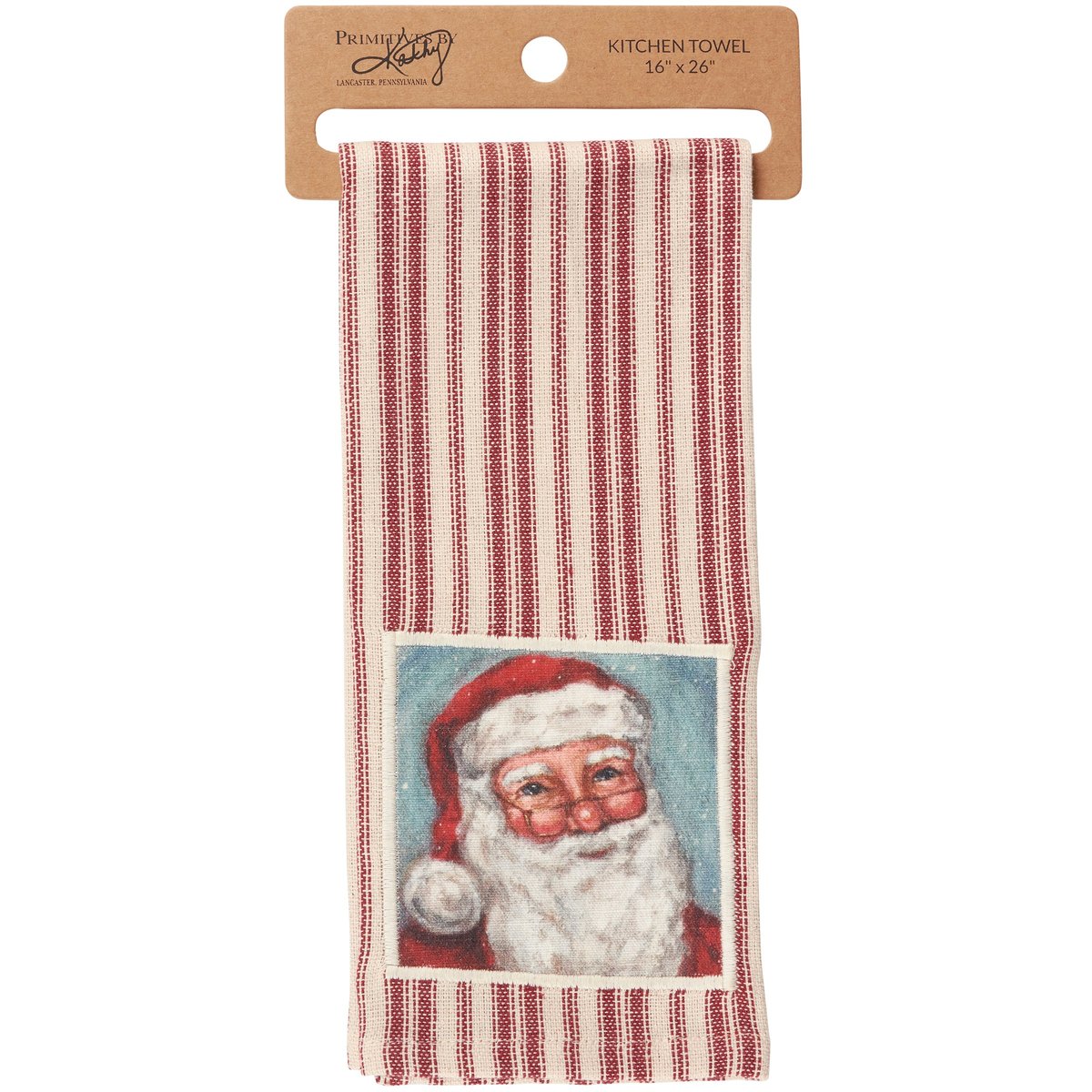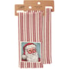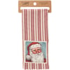 A cotton kitchen towel from our Christmas Collection featuring a stitched art panel with Christmas inspired stripe pattern all-over towel. Art panel displays a merry Santa in a winter scene. Design is replicated from original artwork painted onto burlap canvas, giving the art a unique depth and texture. Our Merry Santa kitchen towel is conveniently machine-washable for easy cleaning. Seasonal kitchen towel is packaged on a cardboard hanger with hole to easily hang on rack. A rustic winter-themed kitchen accessory perfect for seasonal use.