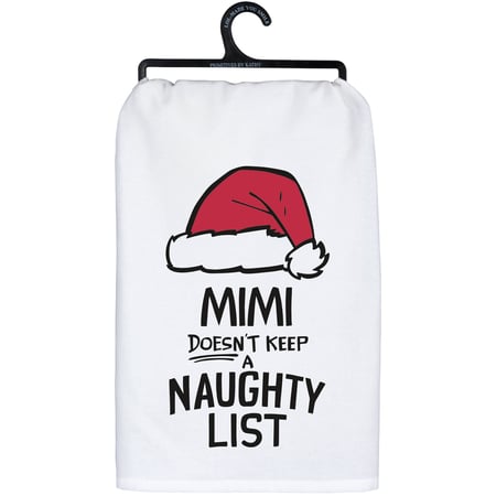 A black and white cotton kitchen towel from our Christmas Collection displaying a unique hand illustrated design of a Santa hat with red accents and a fun grandma inspired Christmas sentiment that reads "Mimi Doesn't Keep A Naughty List." Our Mimi kitchen towel is conveniently machine-washable for easy cleaning. Seasonal kitchen towel is packaged on a black plastic hanger to easily display on rack. A fun grandma-themed Christmas gift perfect for a seasonal kitchen accessory.