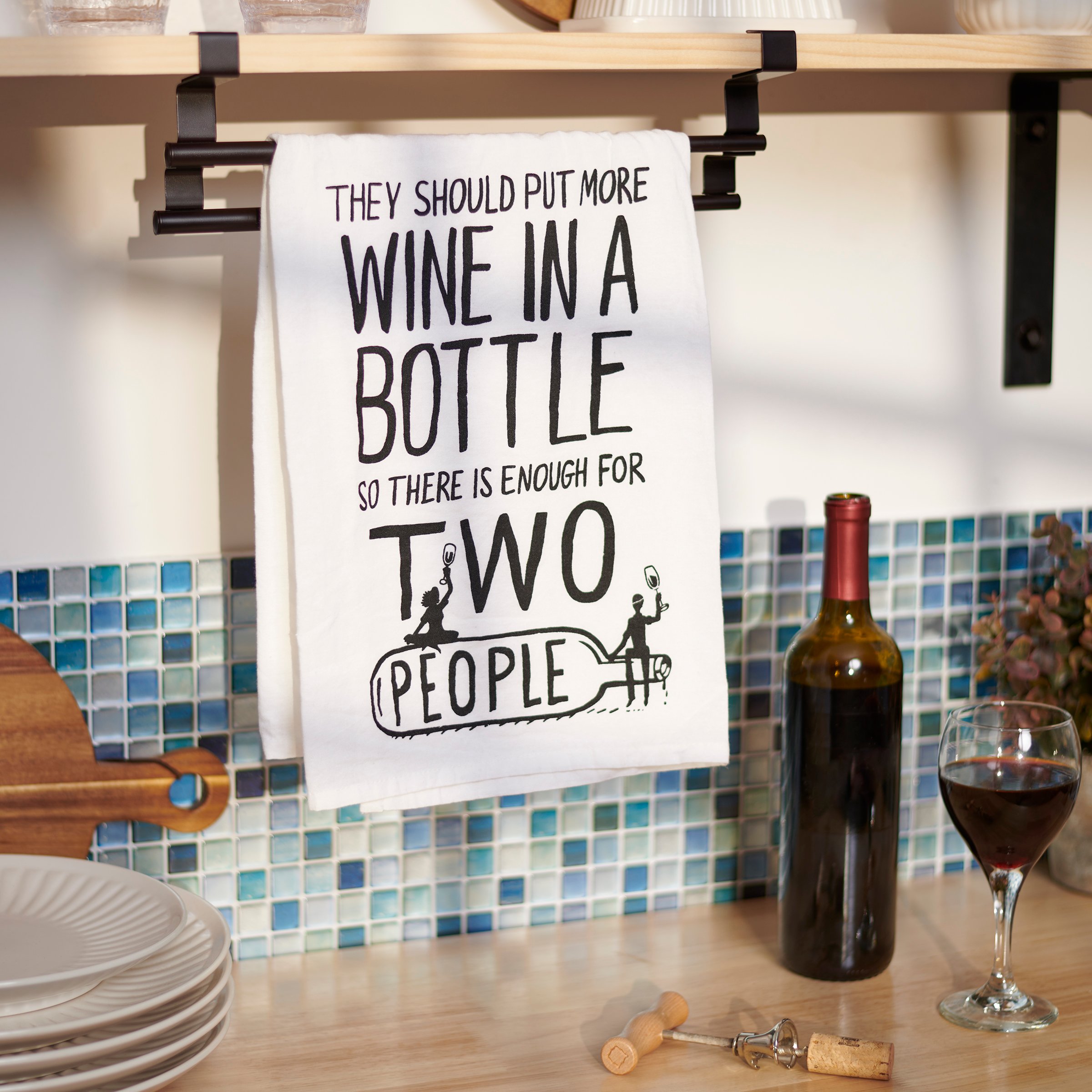 A cotton kitchen towel lending "They Should Put More Wine In A Bottle So There Is Enough For Two People" hand lettered sentiment with characters sitting on wine bottle design. Great for gifting to make for special kitchen decor. Machine-washable.