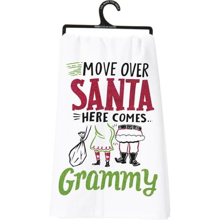 A festive cotton kitchen towel lending "Move Over Santa - Here Comes Grammy" sentiment with grandma in front of Santa design and glitter accents. Machine-washable, glitter will not transfer.