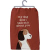 A red cotton kitchen towel displaying a rustic design of a sassy dog with a fun pet-themed sentiment that reads "My Dog And I Talk Shit About You." Our My Dog And I kitchen towel is conveniently machine-washable for easy cleaning. Funny kitchen towel is packaged on a clear plastic hanger to easily display on rack. A fun pet-themed kitchen accessory perfect for everyday use.