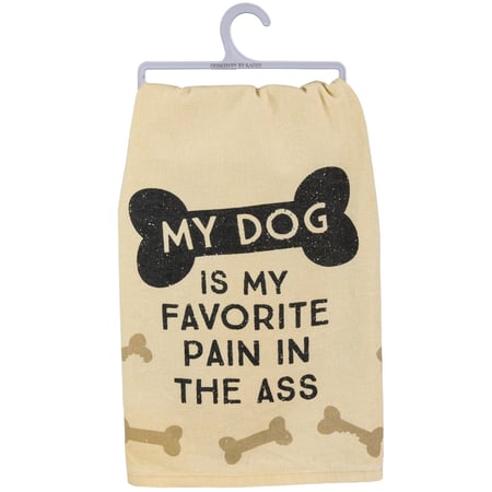 A rustic-inspired cotton kitchen towel lending a distressed "My Dog Is My Favorite Pain In The Ass" sentiment with bone design and border. Complements well with coordinating design pieces. Machine-washable.