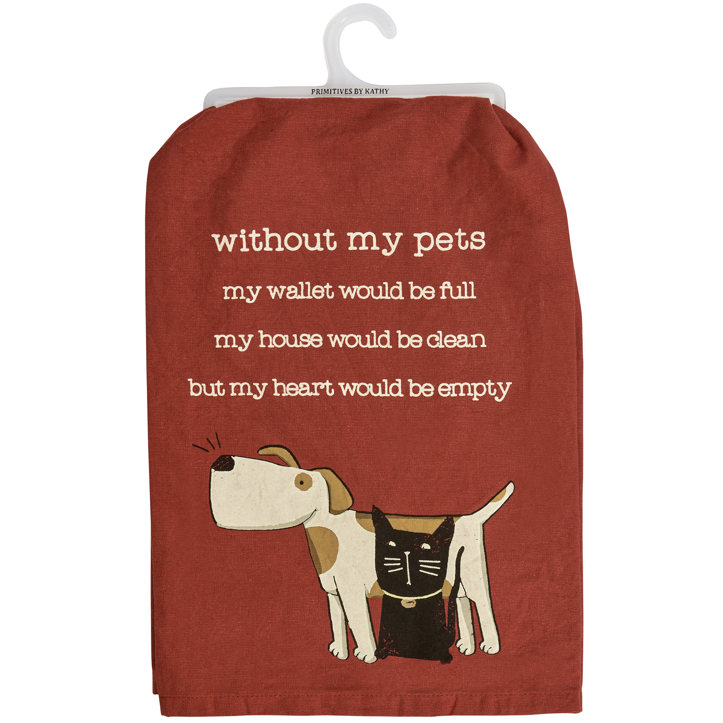 A rustic-inspired cotton kitchen towel from our Pet Collection displaying a design of a cat and dog with a pet-themed sentiment that reads "Without My Pets My Wallet Would Be Full - My House Would Be Clean - But My Heart Would Be Empty." Our My Pets kitchen towel is conveniently machine-washable for easy cleaning. Packaged on a clear plastic hanger to easily display on rack. A fun pet-themed kitchen accessory perfect for everyday use.