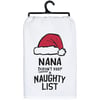 A black and white cotton kitchen towel from our Christmas Collection displaying a unique hand illustrated design of a Santa hat with red accents and a fun grandma inspired Christmas sentiment that reads "Nana Doesn't Keep A Naughty List." Our Nana kitchen towel is conveniently machine-washable for easy cleaning. Seasonal kitchen towel is packaged on a black plastic hanger to easily display on rack. A fun grandma-themed Christmas gift perfect for a seasonal kitchen accessory.
