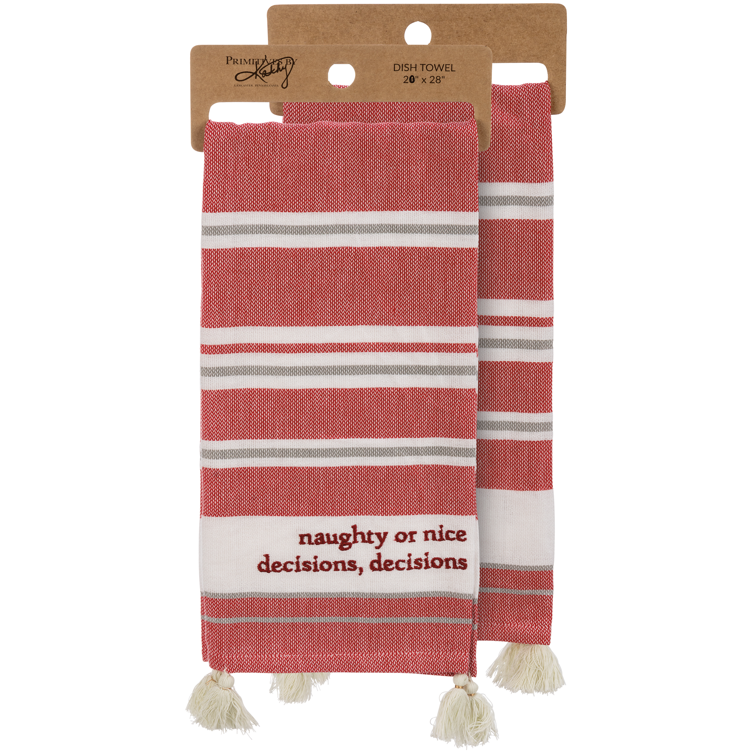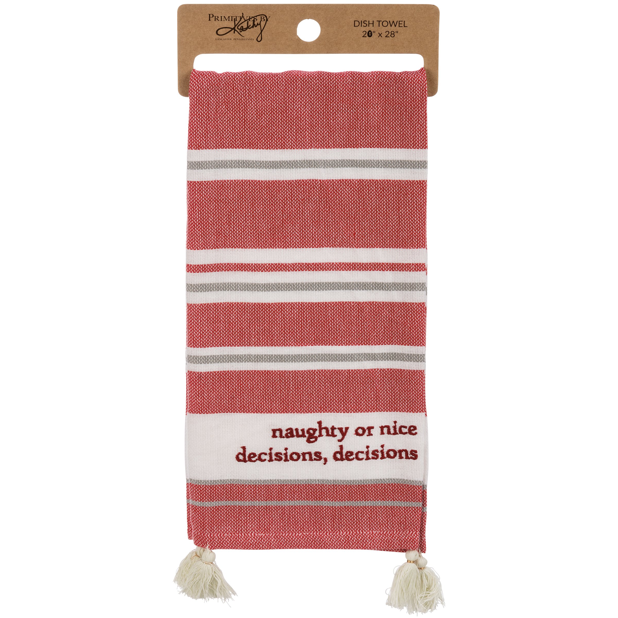 A cotton kitchen towel featuring a holiday-inspired color palette with embroidered "Naughty Or Nice Decisions, Decisions" sentiment and woven stripe designs. Includes tassel accents for added interest. Towel is packaged on a cardboard hanger with a hole to easily hang on rack. Machine-washable.