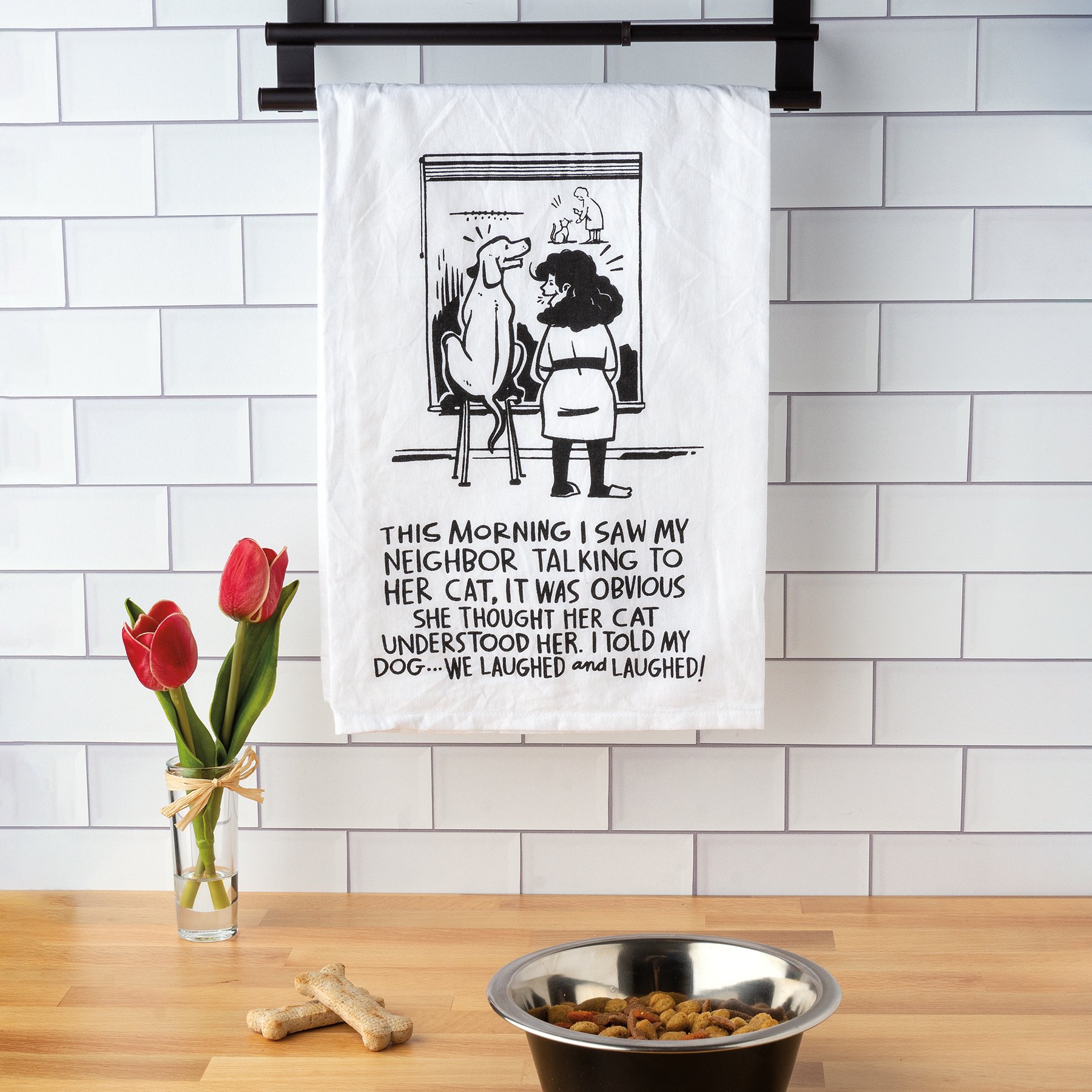A black and white cotton kitchen towel from our Pet Collection featuring a hand lettered "This Morning I Saw My Neighbor Talking To Her Cat, It Was Obvious She Thought Her Cat Understood Her. I Told My Dog...We Laughed And Laughed!" sentiment and coordinating illustration. Our We Laughed And Laughed kitchen towel is machine-washable.