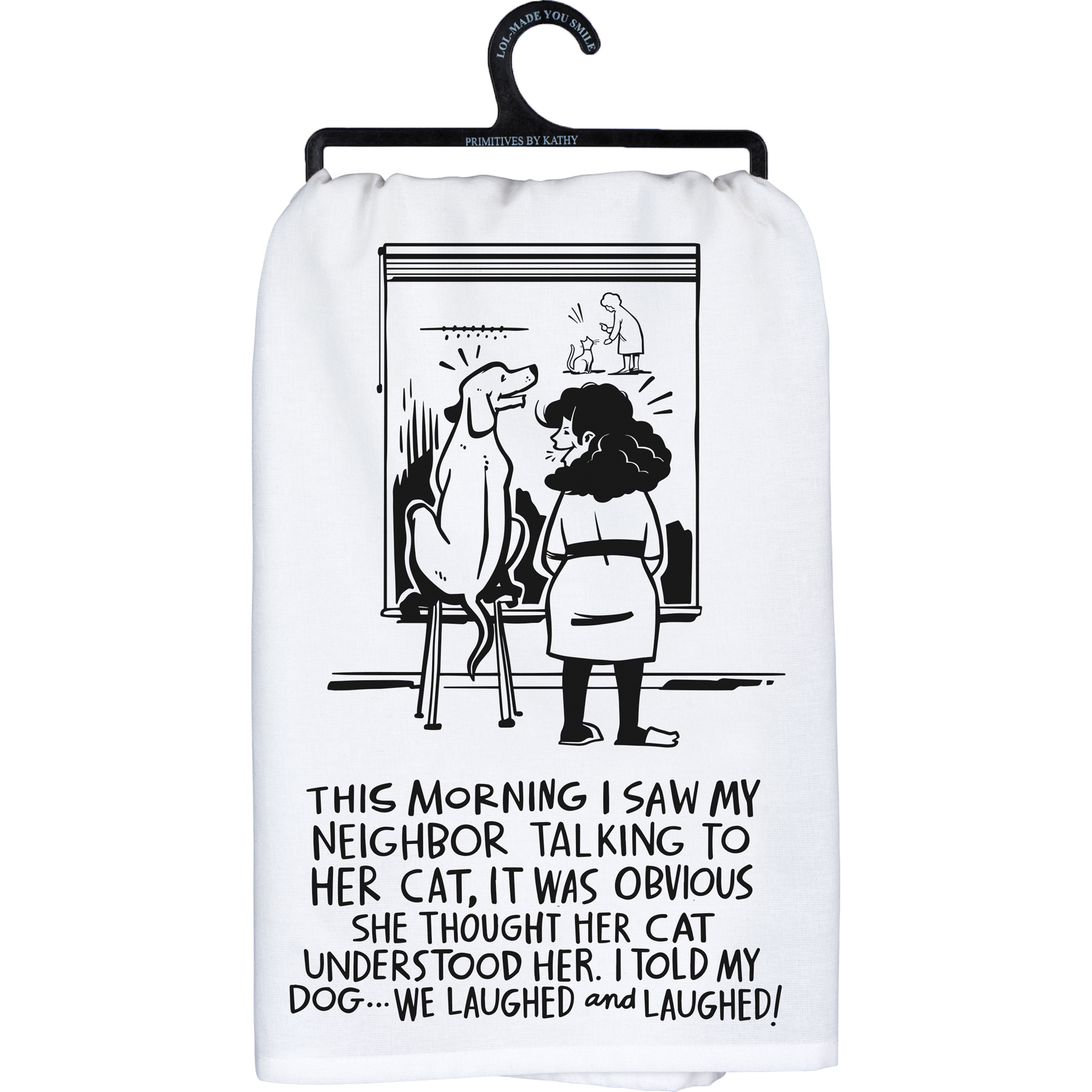 A black and white cotton kitchen towel from our Pet Collection featuring a hand lettered "This Morning I Saw My Neighbor Talking To Her Cat, It Was Obvious She Thought Her Cat Understood Her. I Told My Dog...We Laughed And Laughed!" sentiment and coordinating illustration. Our We Laughed And Laughed kitchen towel is machine-washable.