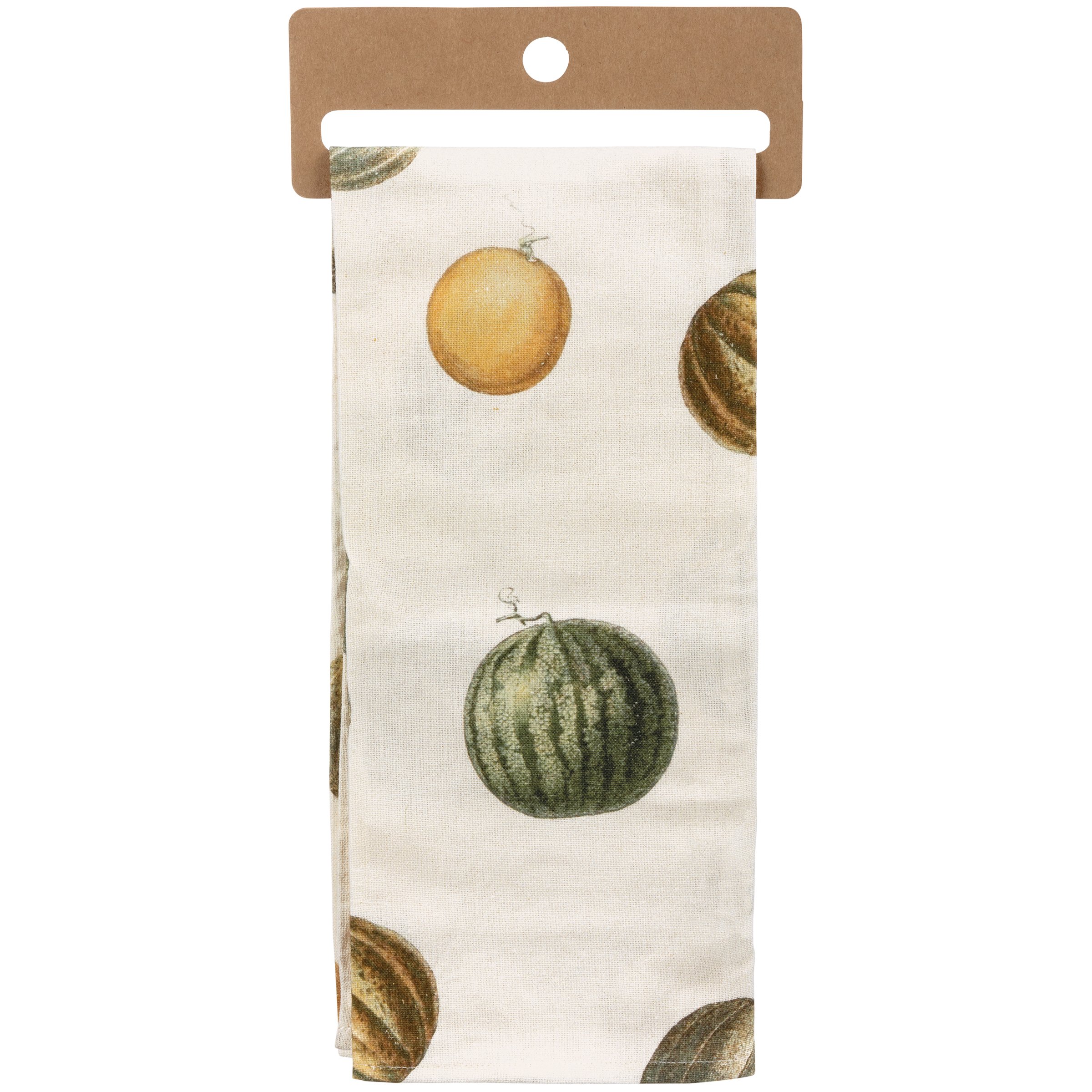 A cotton linen blend kitchen towel featuring all-over retro style bean melon designs and punny embroidered "Nice Melons" sentiment. Features a cotton tape loop in the corner for easy hanging. Machine-washable. Towel is packaged on a cardboard hanger with a hole to easily hang on rack. Features a hangtag displaying the full design.