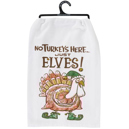 A white cotton kitchen towel from our Fall & Harvest Collection displaying a colorful hand illustrated design of a turkey disguised as an elf with a funny sentiment that reads "No Turkeys Here... Just Elves!" Funny turkey design features glitter details for added interest. Our No Turkeys kitchen towel is conveniently machine-washable for easy cleaning and glitter will not transfer. Seasonal kitchen towel is packaged on a black plastic hanger to easily display on rack. A fun Thanksgiving kitchen accessory perfect for seasonal use.
