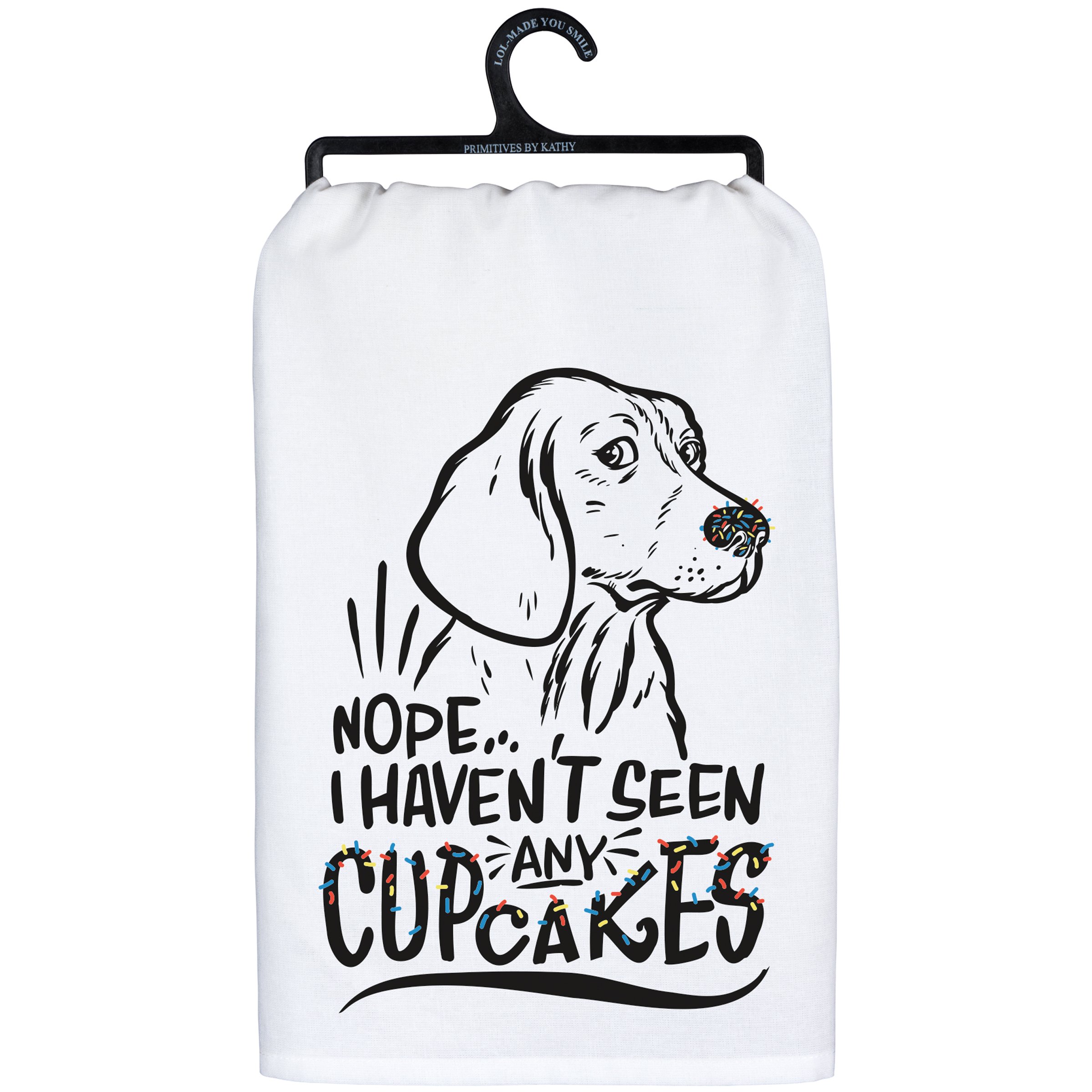 A black and white cotton kitchen towel from our Pet Collection displaying a playful hand illustrated guilty dog design above a funny dog themed sentiment with colorful sprinkle details that reads "Nope... I Haven't Seen Any Cupcakes." Our Dog Haven't Seen Cupcakes kitchen towel is conveniently machine-washable for easy cleaning. This funny kitchen towel is packaged on a black plastic hanger to easily display on rack. A fun dog themed gift perfect for adding personality to any kitchen while showing off a love for pets.