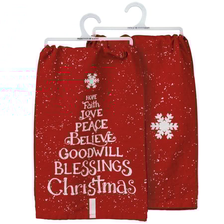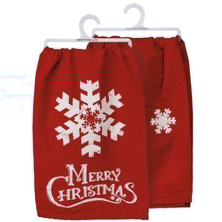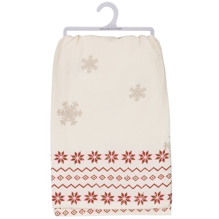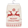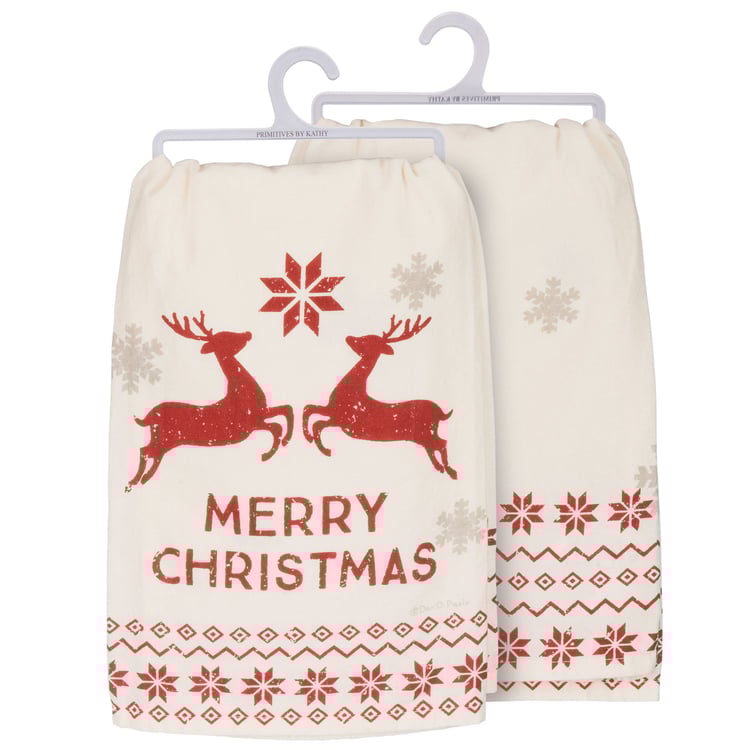 A rustic, Nordic-inspired cotton kitchen towel lending "Merry Christmas" sentiment with reindeer design and wrap-around zigzag and snowflake border print. Complements well with coordinating design pieces for a festive holiday collection. Machine-washable.