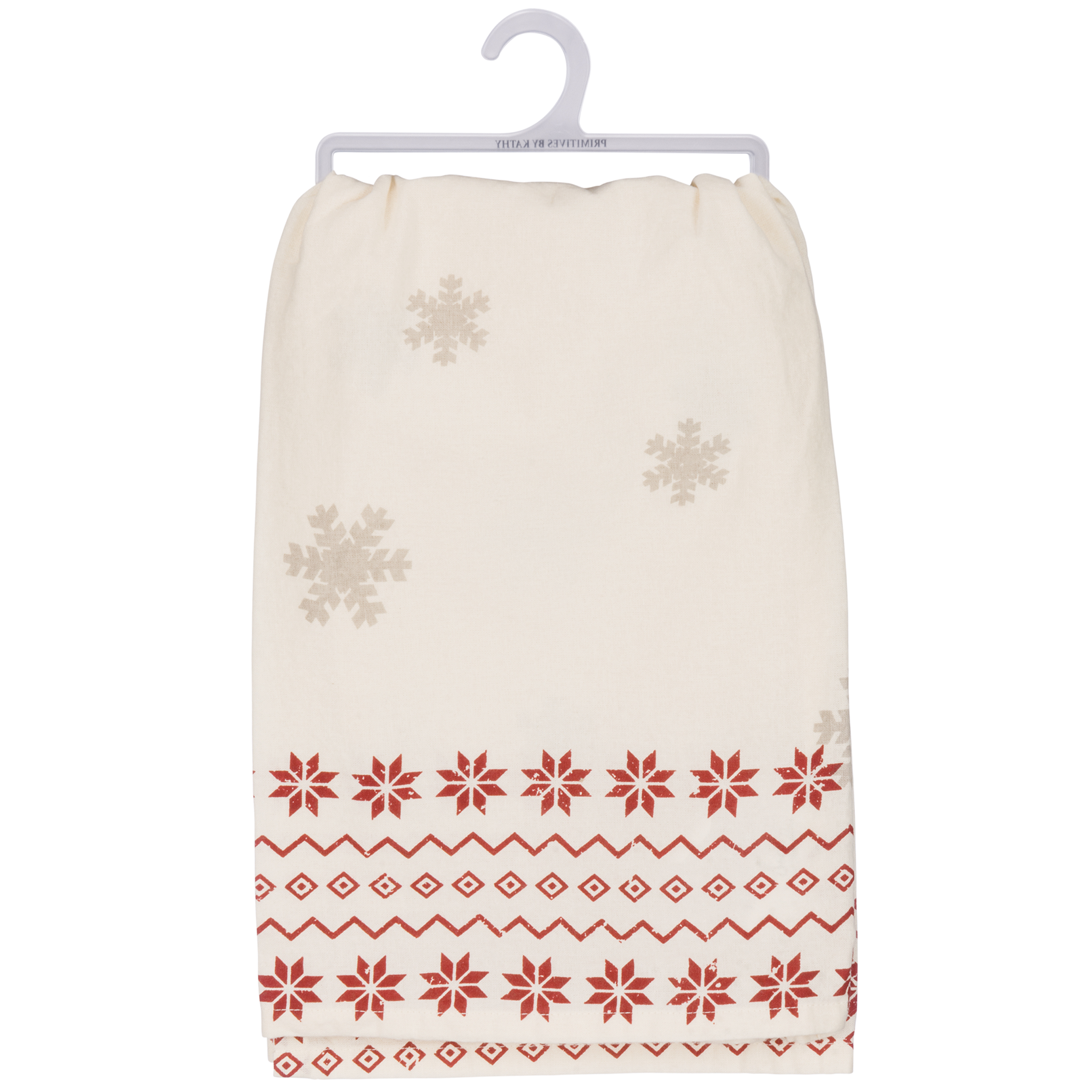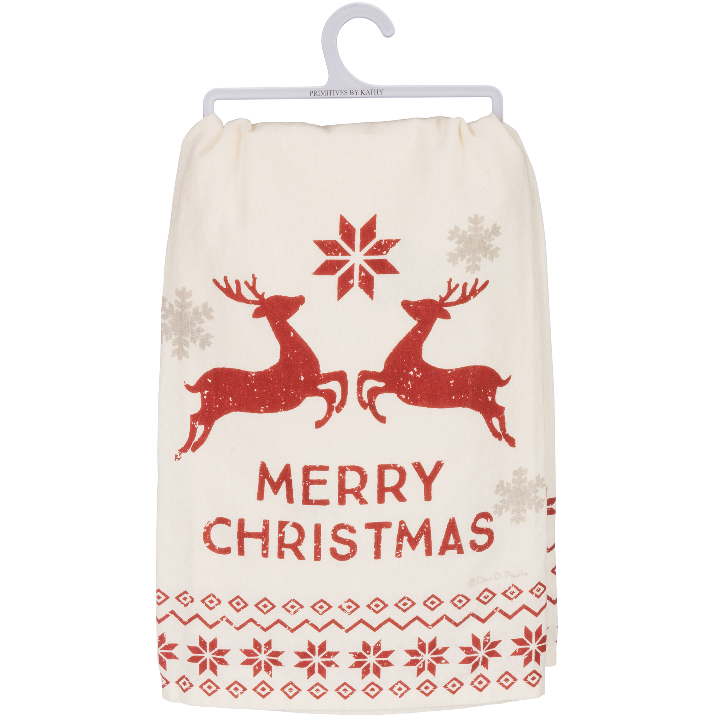 A rustic, Nordic-inspired cotton kitchen towel lending "Merry Christmas" sentiment with reindeer design and wrap-around zigzag and snowflake border print. Complements well with coordinating design pieces for a festive holiday collection. Machine-washable.