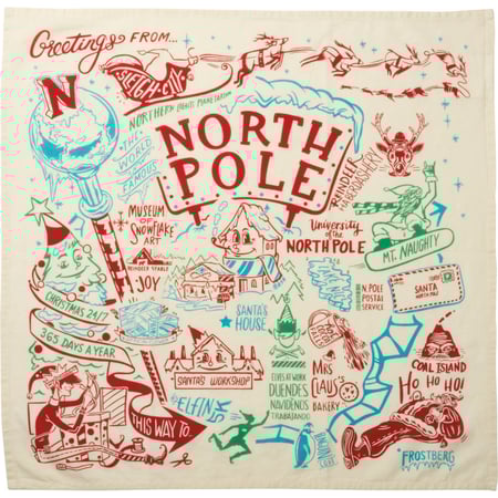 A fully-printed and vibrant North Pole-themed cotton kitchen towel lending various illustrations and captions associated with the most magical place on earth throught. Machine-washable.