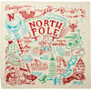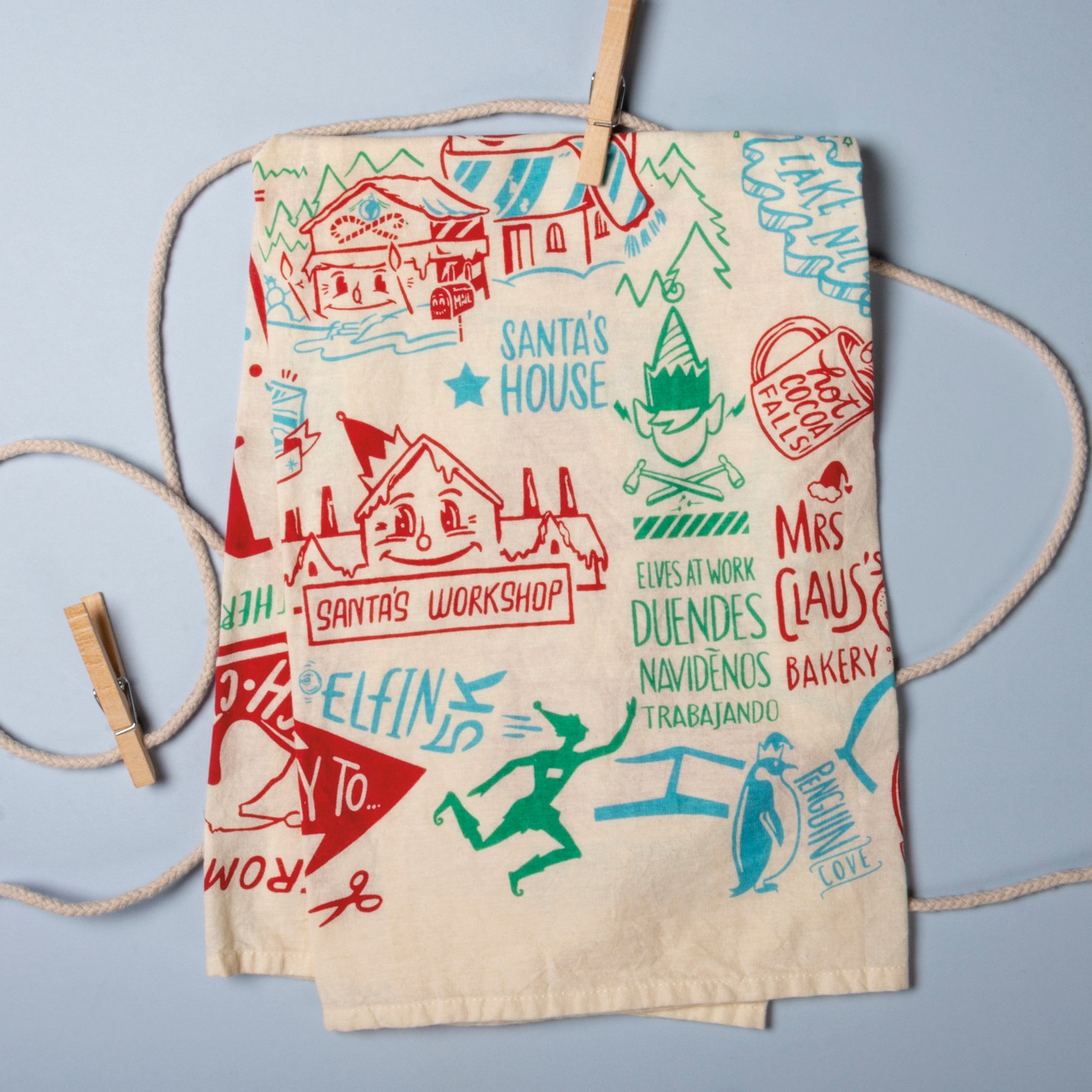 A fully-printed and vibrant North Pole-themed cotton kitchen towel lending various illustrations and captions associated with the most magical place on earth throught. Machine-washable.