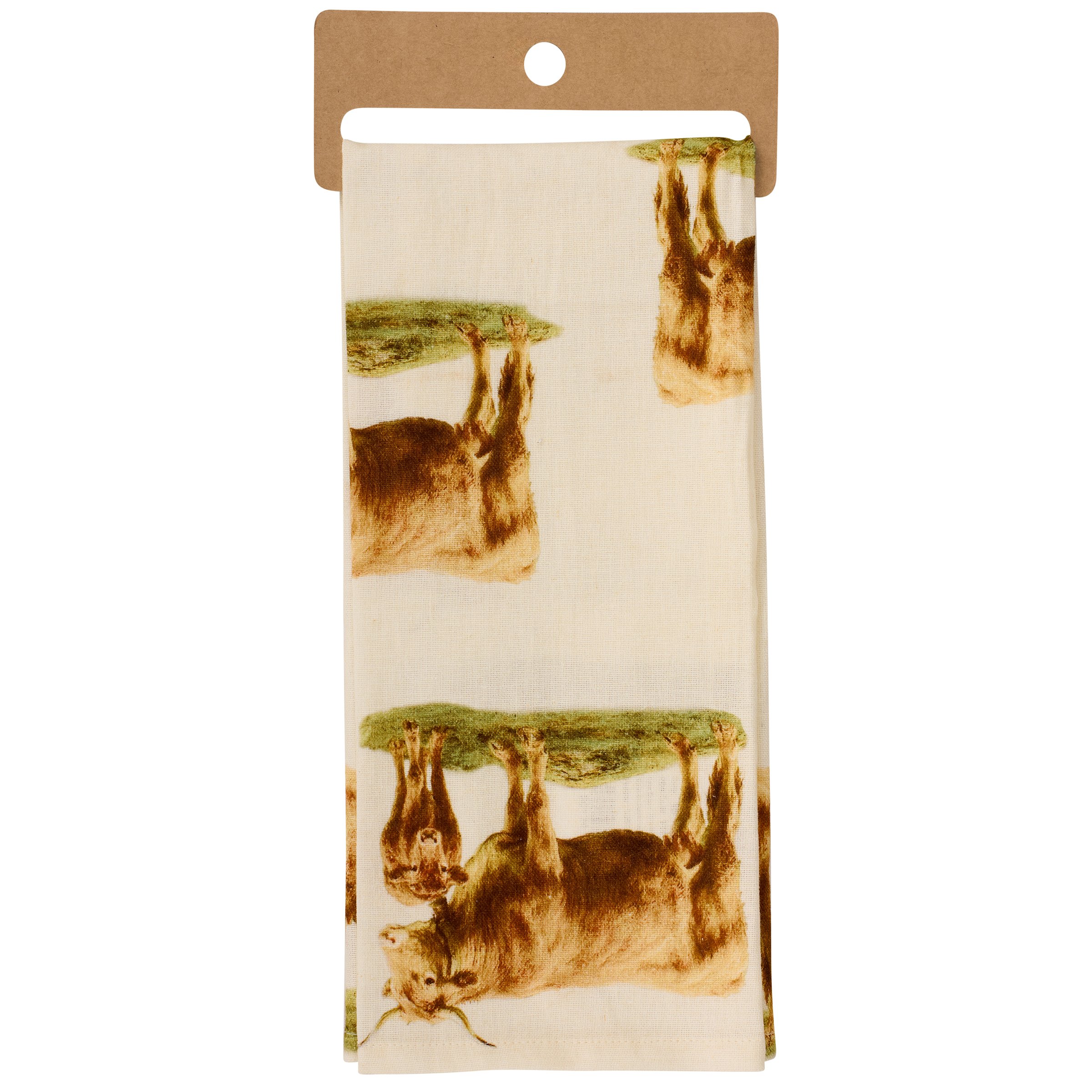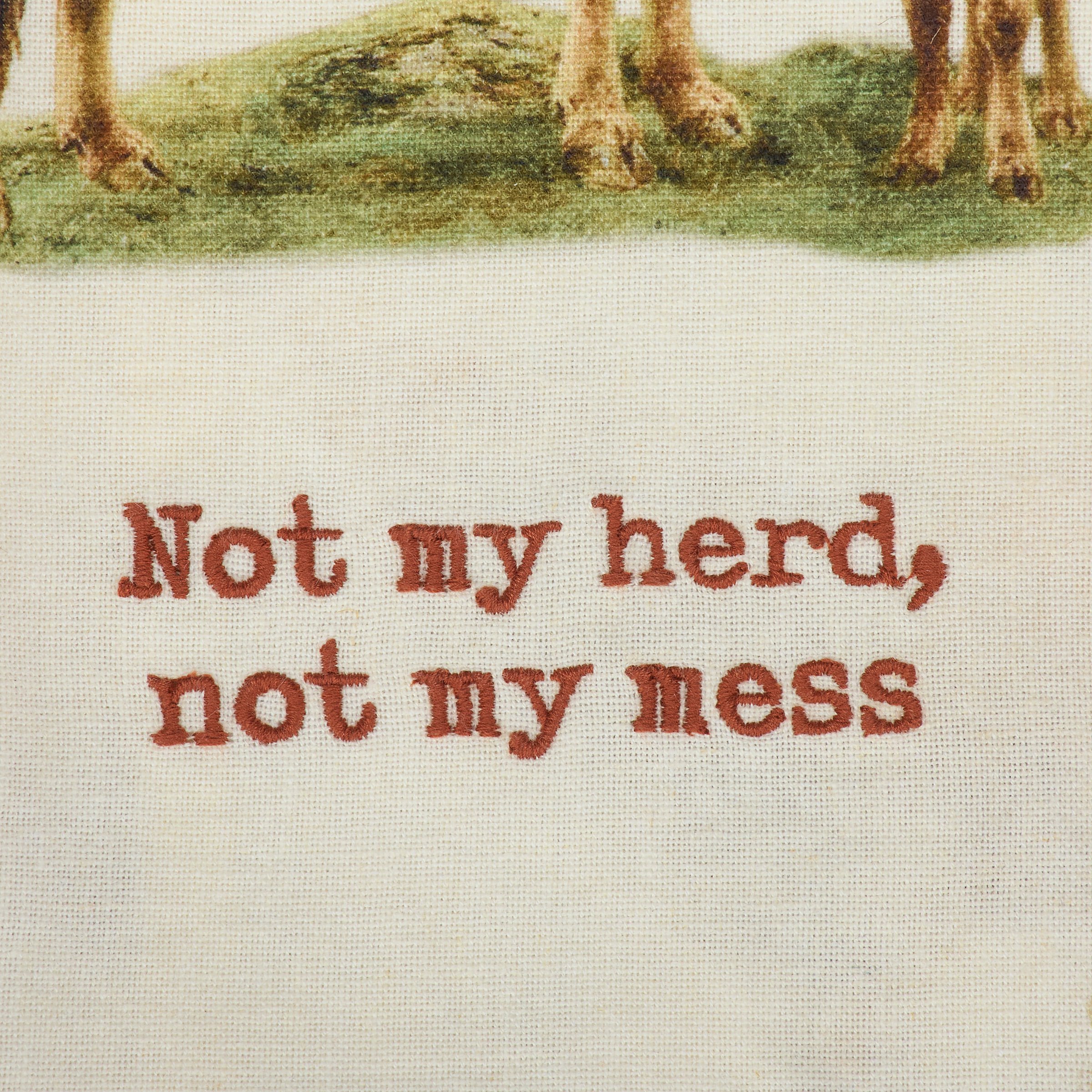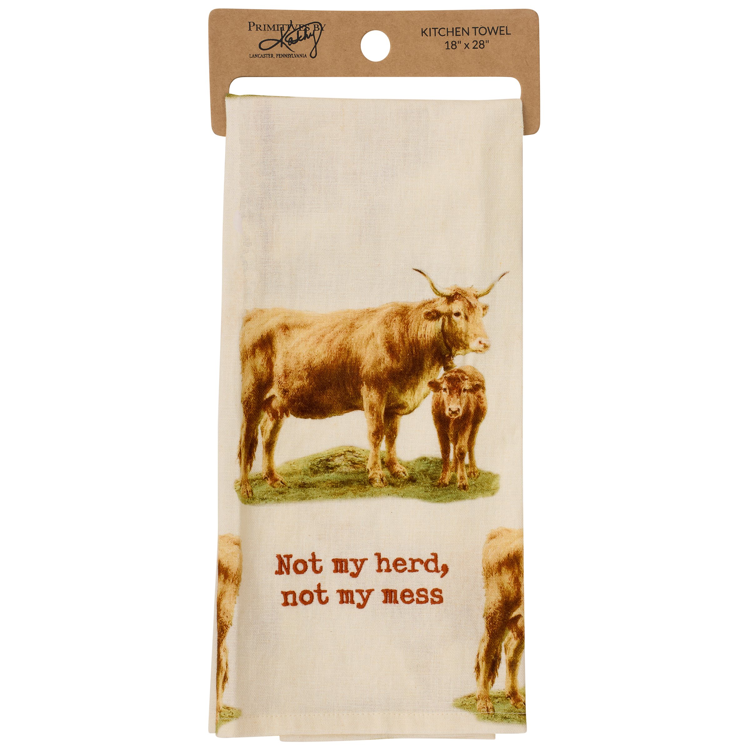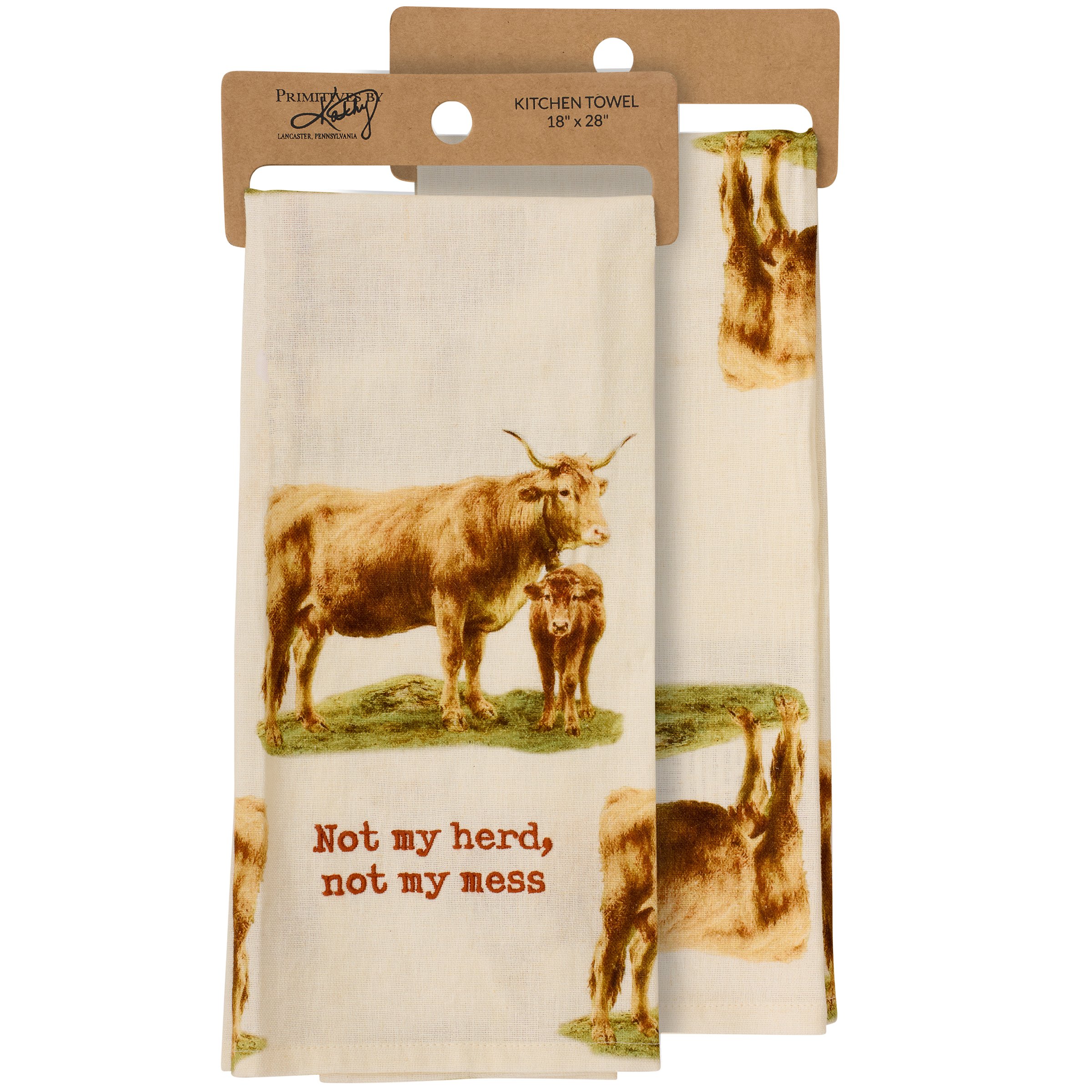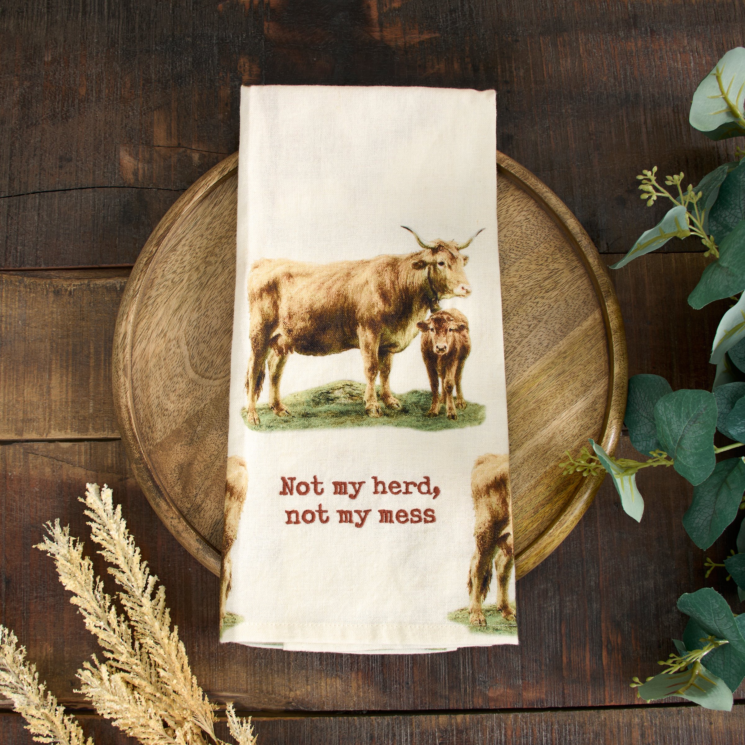 A cotton-linen kitchen towel from our Farmhouse Collection featuring an all-over design displaying vintage art of a cow and calf with a fun cow pun that reads "Not My Herd, Not My Mess." Farm animal pun sentiment is embroidered for added interest. Our Not My Herd kitchen towel is conveniently machine-washable for easy cleaning. Farm kitchen towel is packaged on a cardboard hanger with hole to easily display on rack. A fun farm themed gift perfect for adding personality to any kitchen.